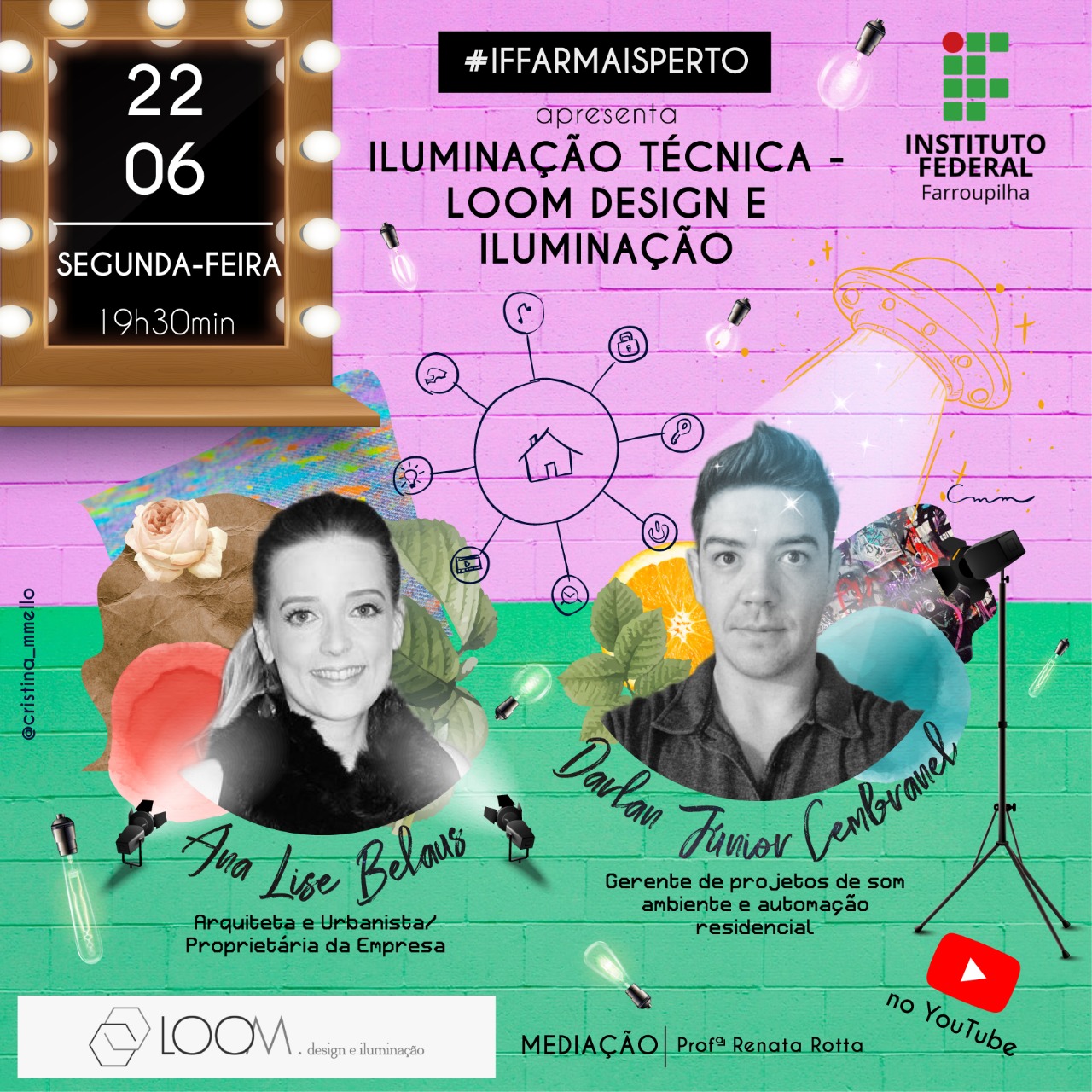 Seg. 22/06 - 19h30 - Iluminação Técnica com Loom Design e Iluminação - Youtube IFFar Campus Santa Rosa - https://www.youtube.com/watch?v=yFC-WEXTFhIBacharelado em Arquitetura e Urbanismo