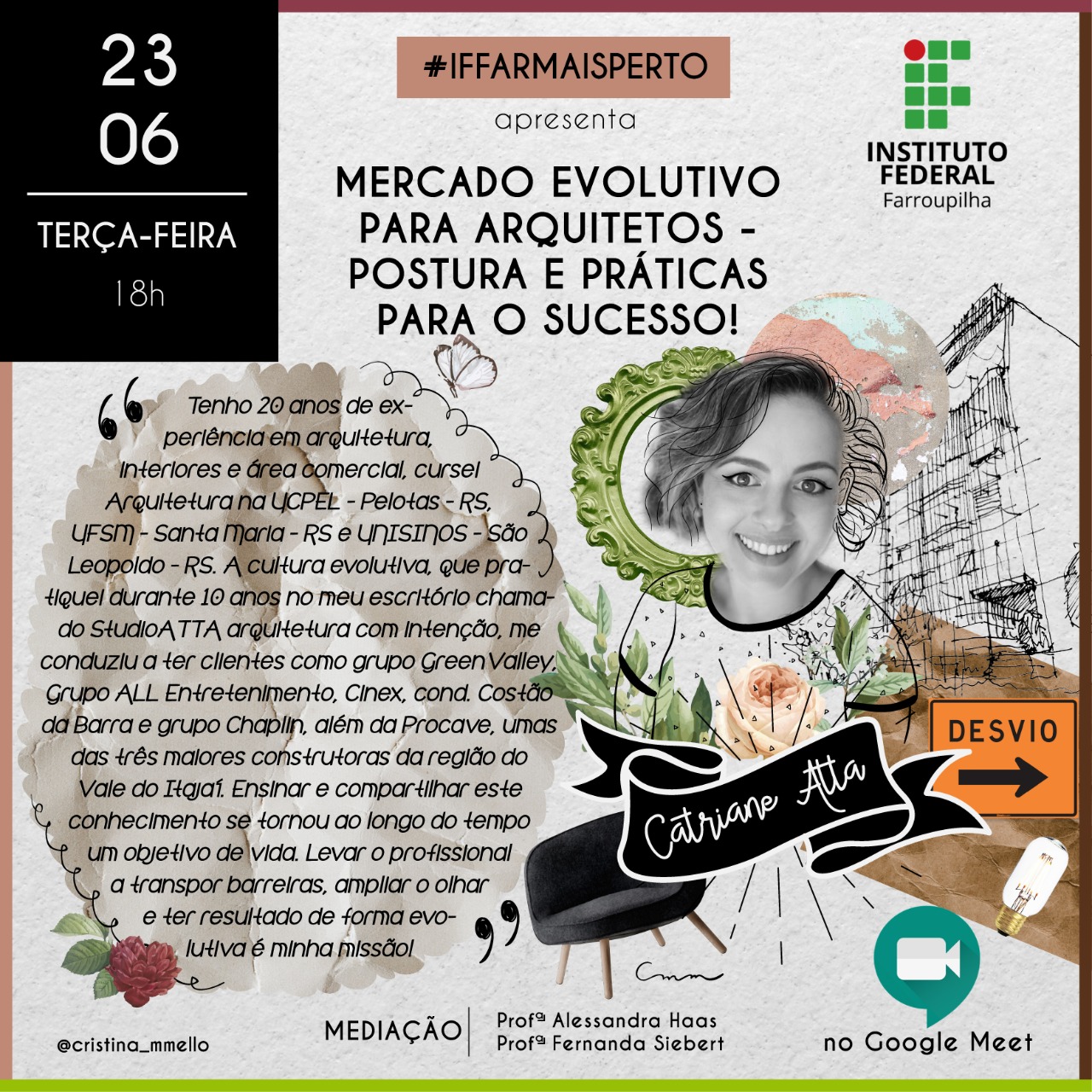 Ter. 23/06 - 18h - Mercado Evolutivo para Arquitetos - Postura e Práticas para o Sucesso! com Catriane Atta – Meet - https://meet.google.com/wxz-jpur-zzr