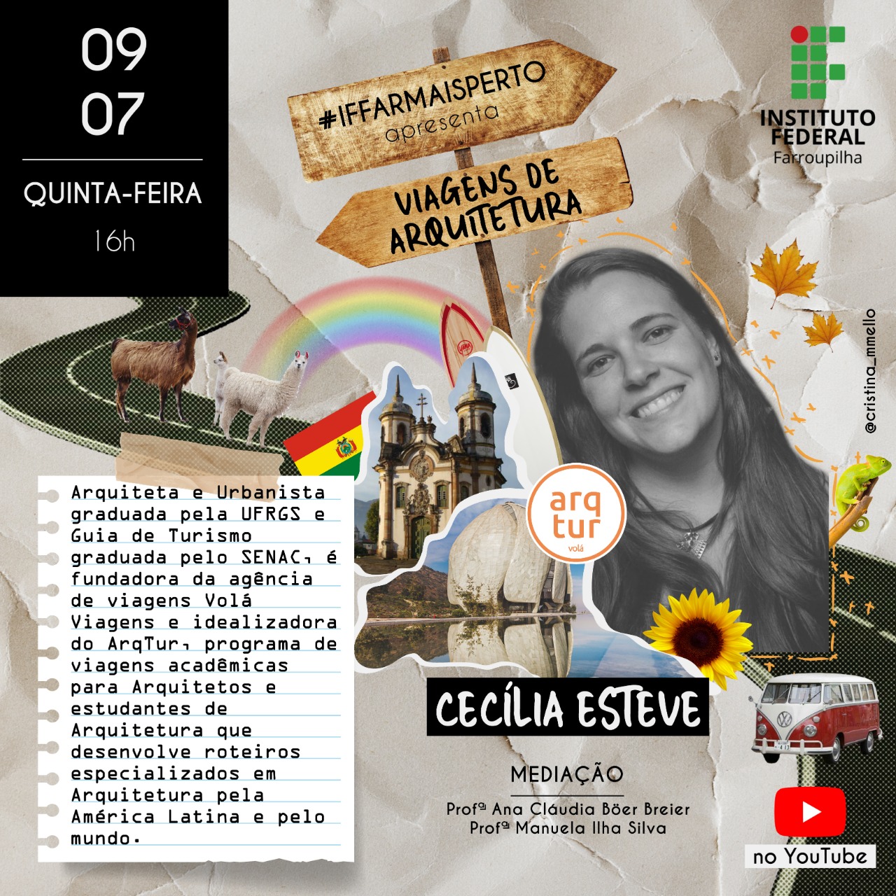 Quinta, 09/07 - 16h - Viagens de Arquitetura, com Cecília Esteve, da agência de viagens Volá. Via Youtube IFFar - Campus Santa Rosa