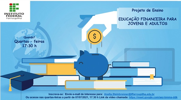 Educação Financeira para Jovens e Adultos: Todas as quartas, às 17h30. Inscrições com a professora Anelia Steinbrenner (Este endereço de email está sendo protegido de spambots. Você precisa do JavaScript ativado para vê-lo.). Oferece certificação.
