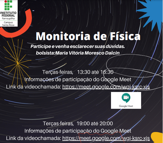Monitoria de Física Terças-feiras, em dois momentos, das 13h30 às 16h, e das 19h às 20h.