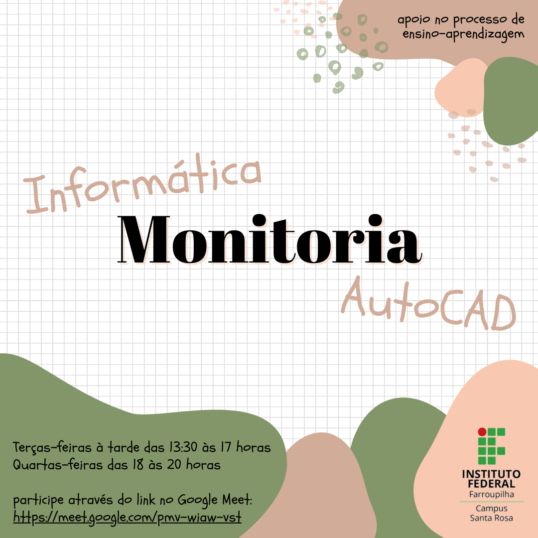 Confira quais são as disciplinas com monitorias ofertadas, os dias e horários dos encontros virtuais:
