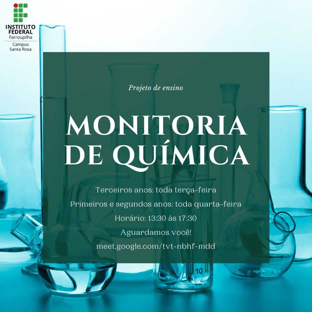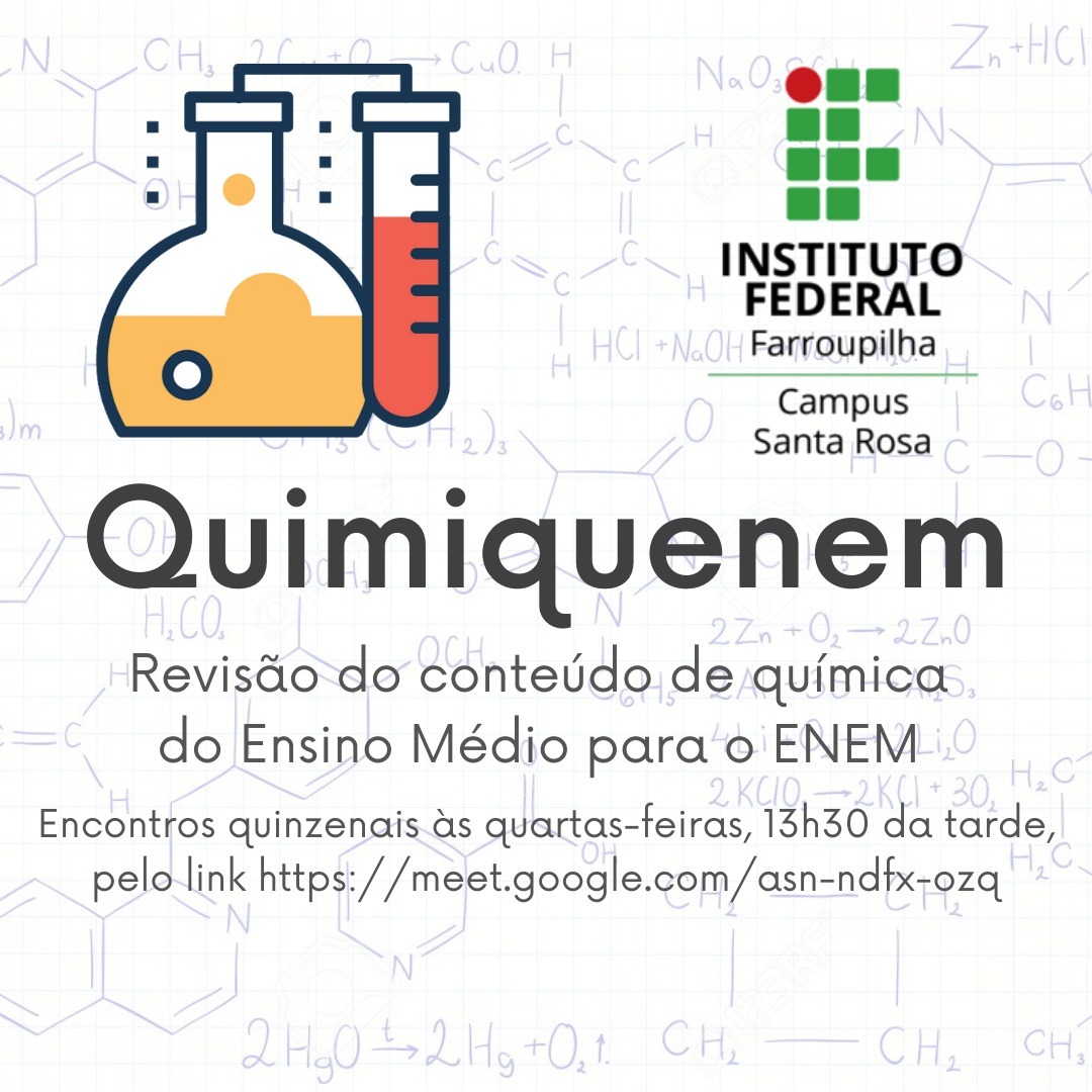 Quimiquenem: revisão de conteúdo de Química do Ensino Médio para o Enem. Encontros quinzenais, às quartas, 13h30.