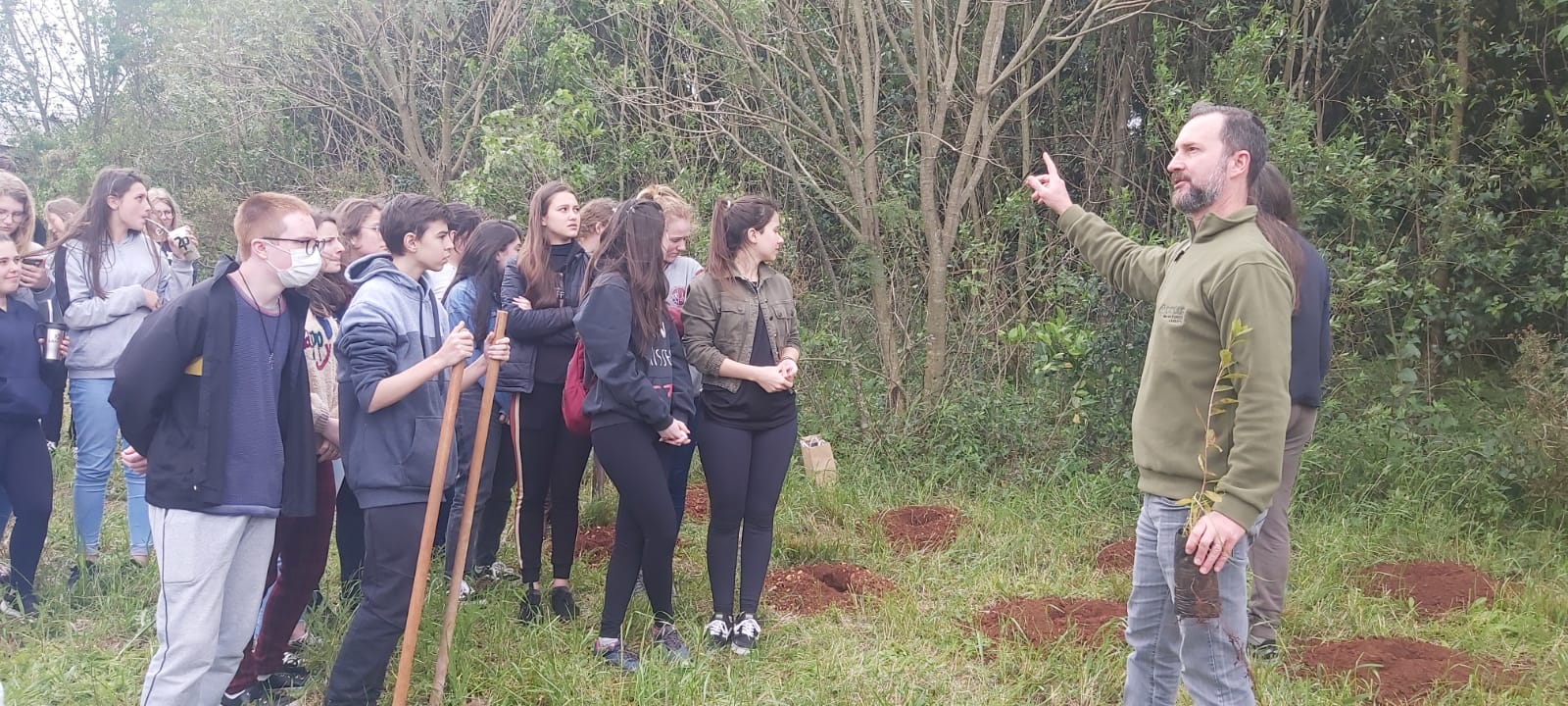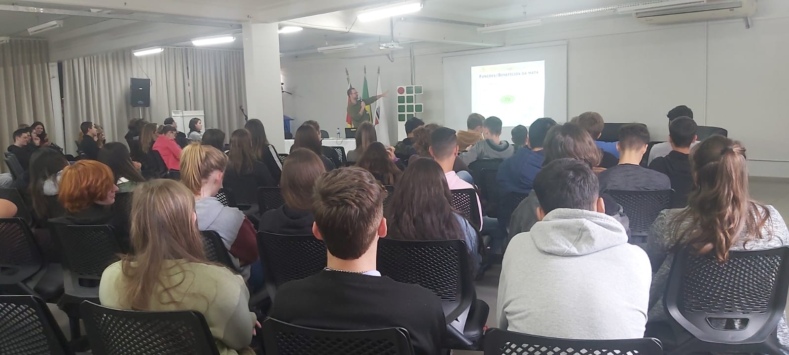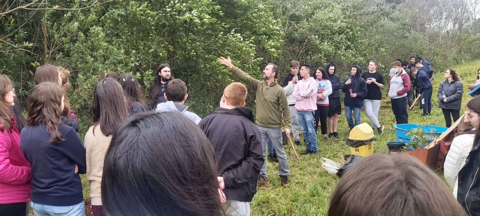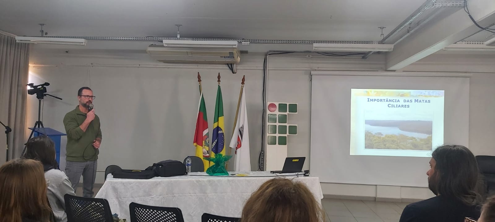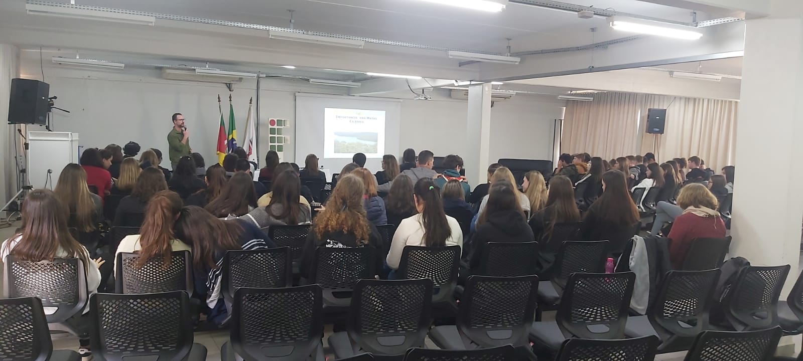 Antes do plantio, os alunos e demais convidados assistiram à palestra ministrada pelo engenheiro florestal Émerson Sichinel, na qual foi abordada a importância da preservação das matas ciliares.