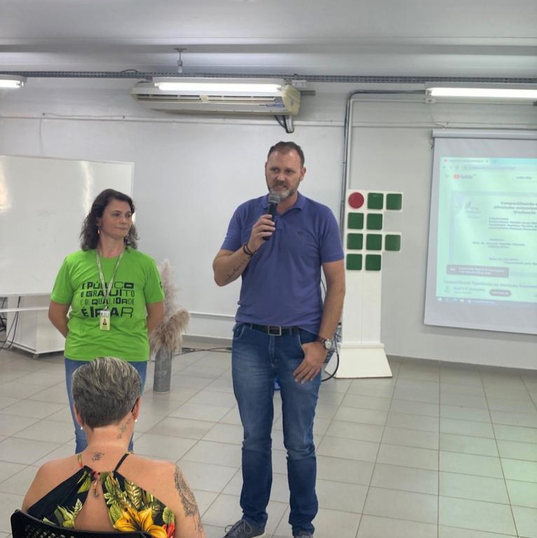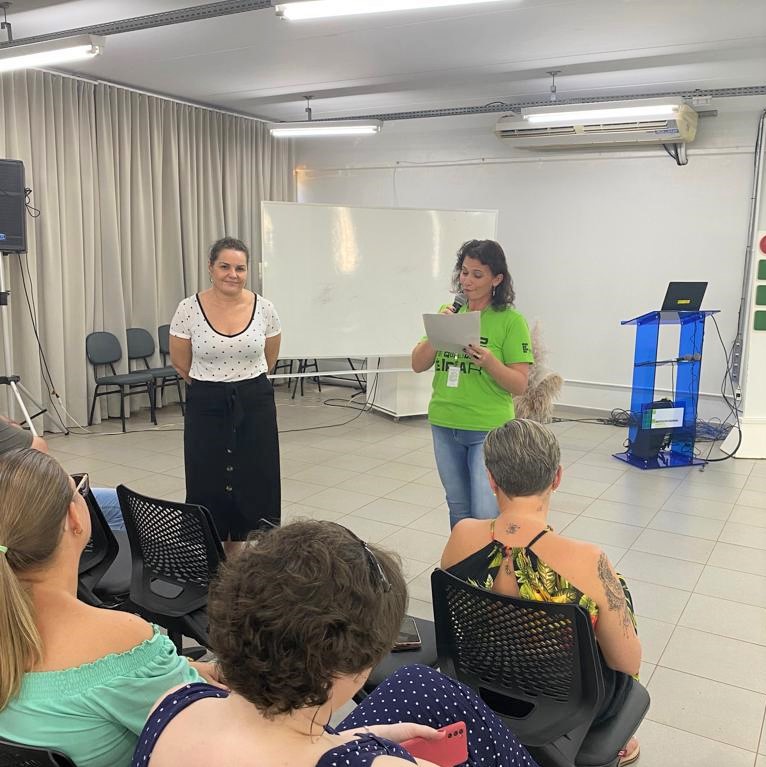 Foto: Diretora-geral, Analice Marchezan, apresenta o novo diretor de Pesquisa, Extensão e Produção, professor Adriano Wagner, em reunião geral.