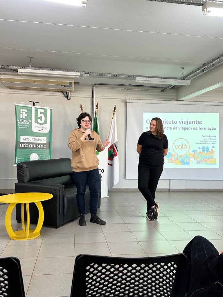 Cecília é Arquiteta e Urbanista graduada pela UFRGS (2013) e Guia de Turismo formada pelo SENAC (2015). O evento foi organizado pelo Diretório Acadêmico do Curso de Arquitetura e Urbanismo (DACAU) e ocorreu no auditório do campus, contando com a presença de professores e acadêmicos de diversos semestres do curso. A palestrante contou um pouco sobre sua trajetória acadêmica e profissional e abordou o papel das viagens como elemento transformador na formação do profissional Arquiteto e Urbanista.