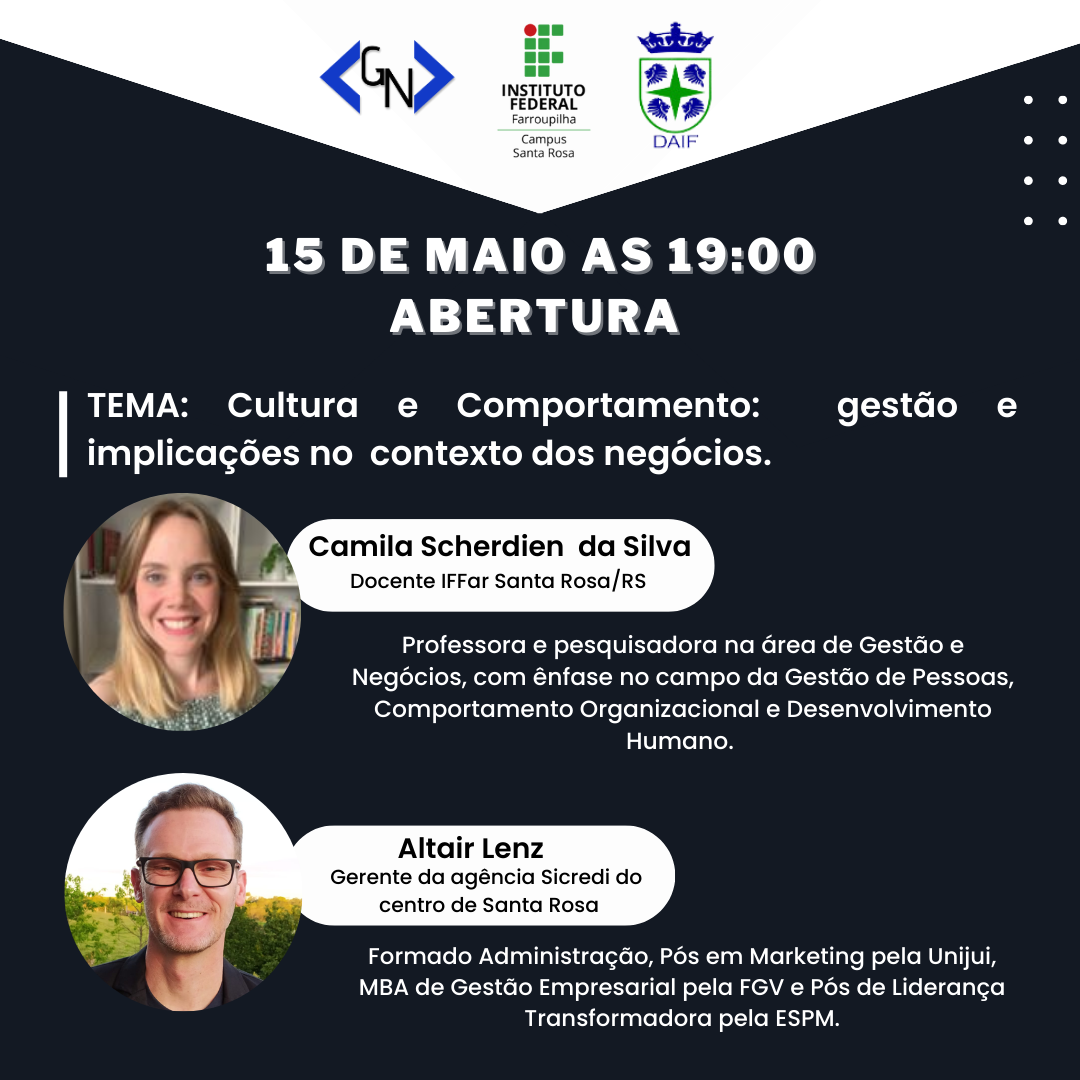 Segunda,15/05: Altair Lenz e Camila Scherdien - Cultura e Comportamento: gestão e implicações no contexto dos negócios.