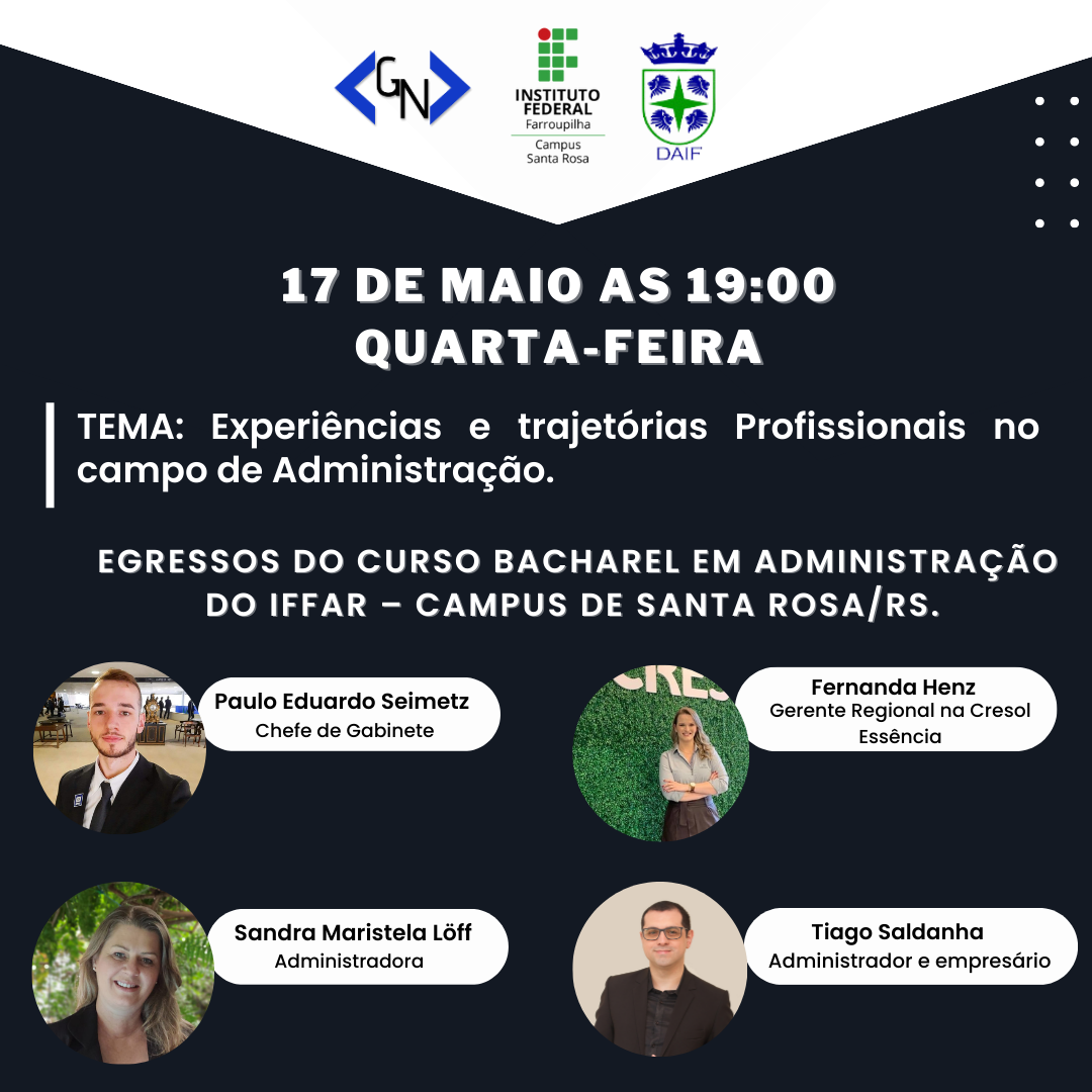Quarta, 17/05: Egressos do curso Bacharel em Administração do IFFar – Campus Santa Rosa - Experiências e trajetórias Profissionais no campo de Administração.