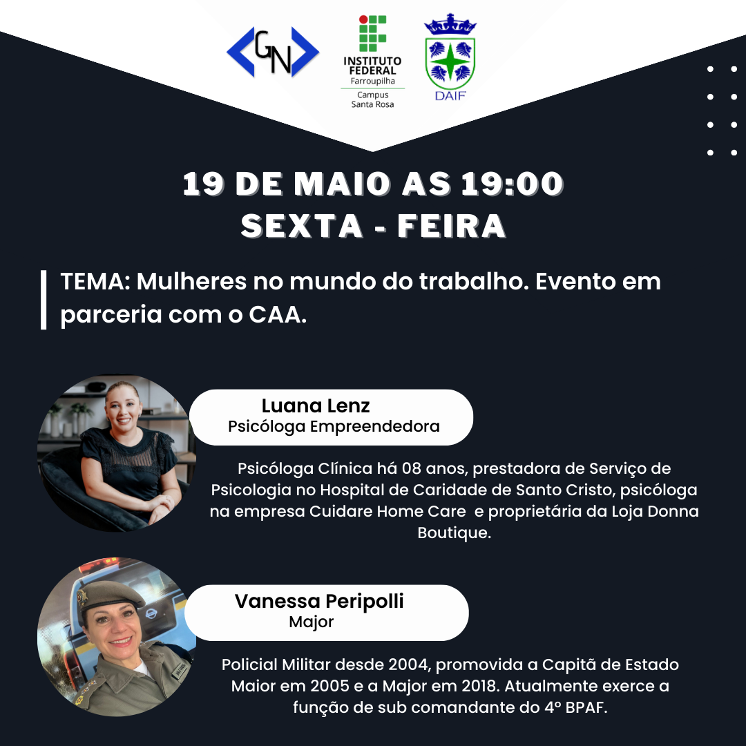Sexta, 19/05: Luana Lenz e Vanessa Peripolli - Mulheres no mundo do trabalho. Evento em parceria com o CAA.