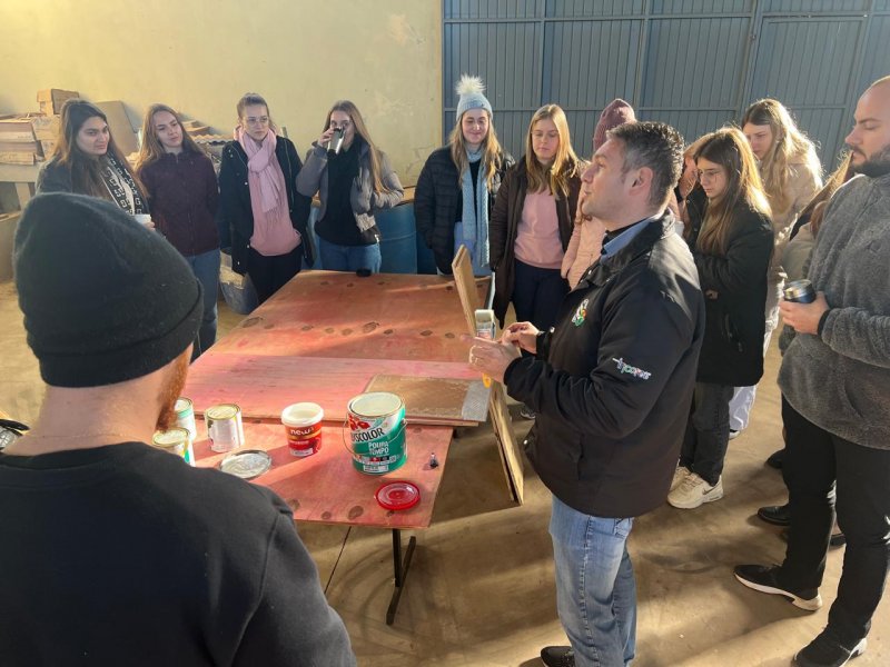 Na sequência, os estudantes realizaram uma atividade prática no laboratório de edificações, aplicando tintas fosca, acetinada e semibrilho, analisando as principais diferenças de acabamento.