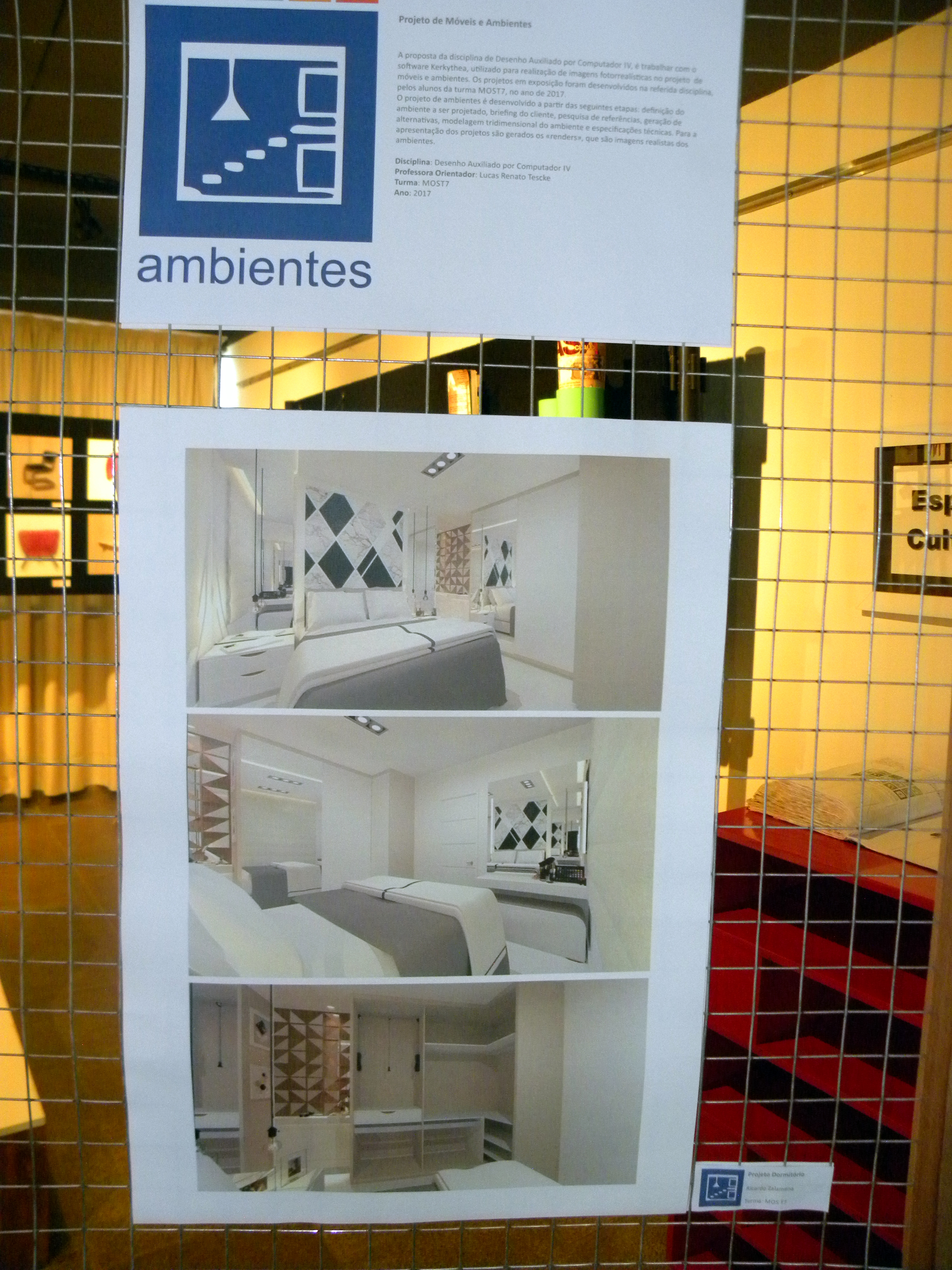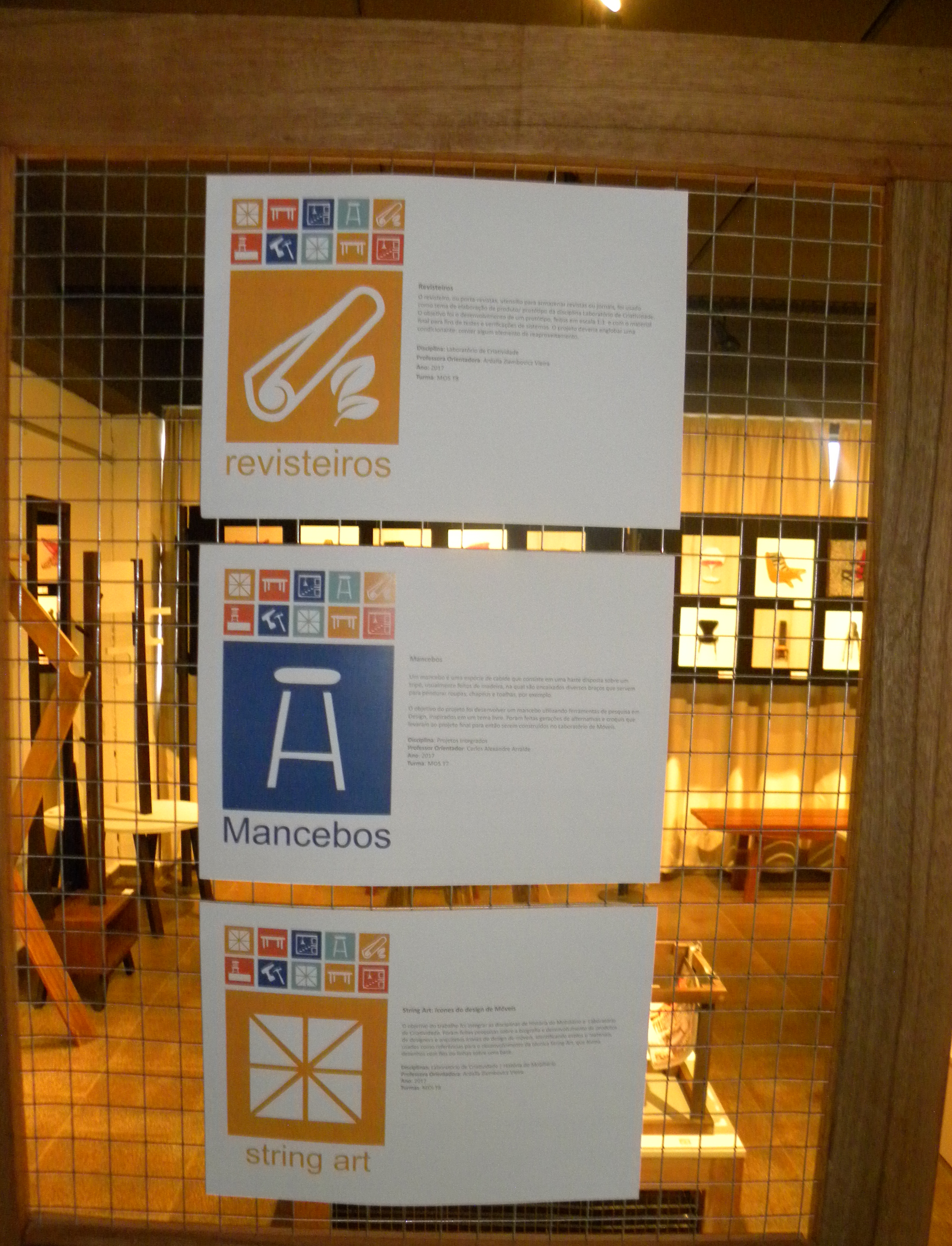 Os trabalhos destacam-se a partir de Revisteiros, Mancebos, String Art e Ambientes. Os alunos executaram as peças usando todo o conhecimento adquirido ao longo do curso nas disciplinas de Laboratório de Criatividade, Projetos Integrados e Desenho Auxiliado por Computador IV. A orientação dos alunos ficou por conta dos professores Ardalla Z. Vieira, Carlos Alexandre Arralde e Lucas Tescke. Também colaboraram os professores Juliano Coimbra e Neide Kunkel. Os trabalhos foram produzidos no Laboratório de Móveis do Campus com a colaboração do laboratorista Pedro Galina.