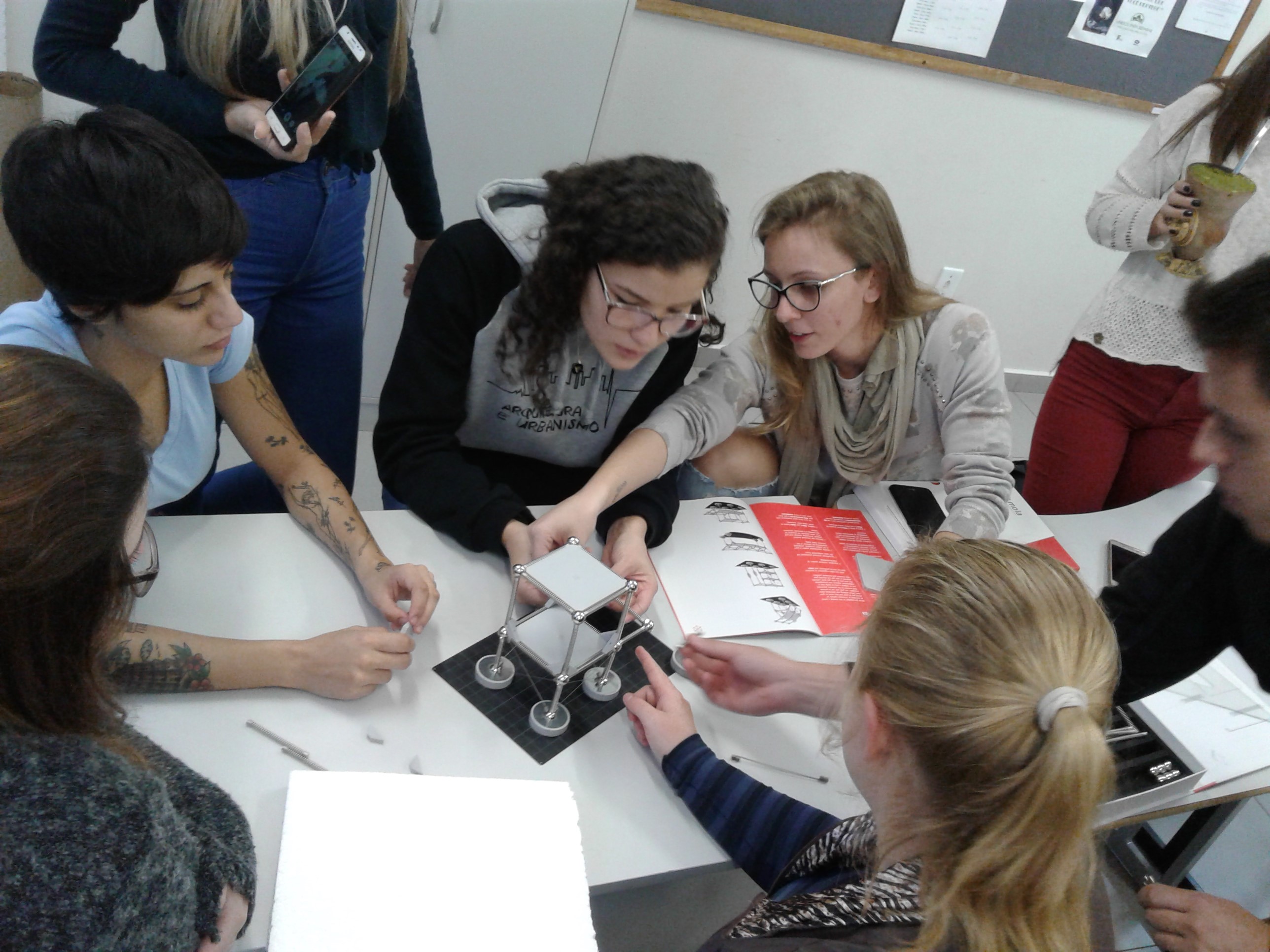 Na manhã de hoje (18), os acadêmicos do bacharelado em Arquitetura e Urbanismo (ARQ T2) puderam aprimorar seus conhecimentos no estudo de estruturas através da experimentação do Kit Mola 1 e 2. A experiência foi orientada pela professora Neidi Kunkel, na disciplina de Sistemas Estruturais IV. O objetivo da atividade foi estruturar uma edificação, fazendo uso do menor número possível de ligações e apoios. O kit mola é composto por molas, fios, ímãs, esferas e placas de aço que ajudam na visualização das construções ao simular o comportamento das estruturas das edificações. O kit utilizado hoje pelos alunos foi doado pelo Diretório Acadêmico do Curso de Arquitetura e Urbanismo.