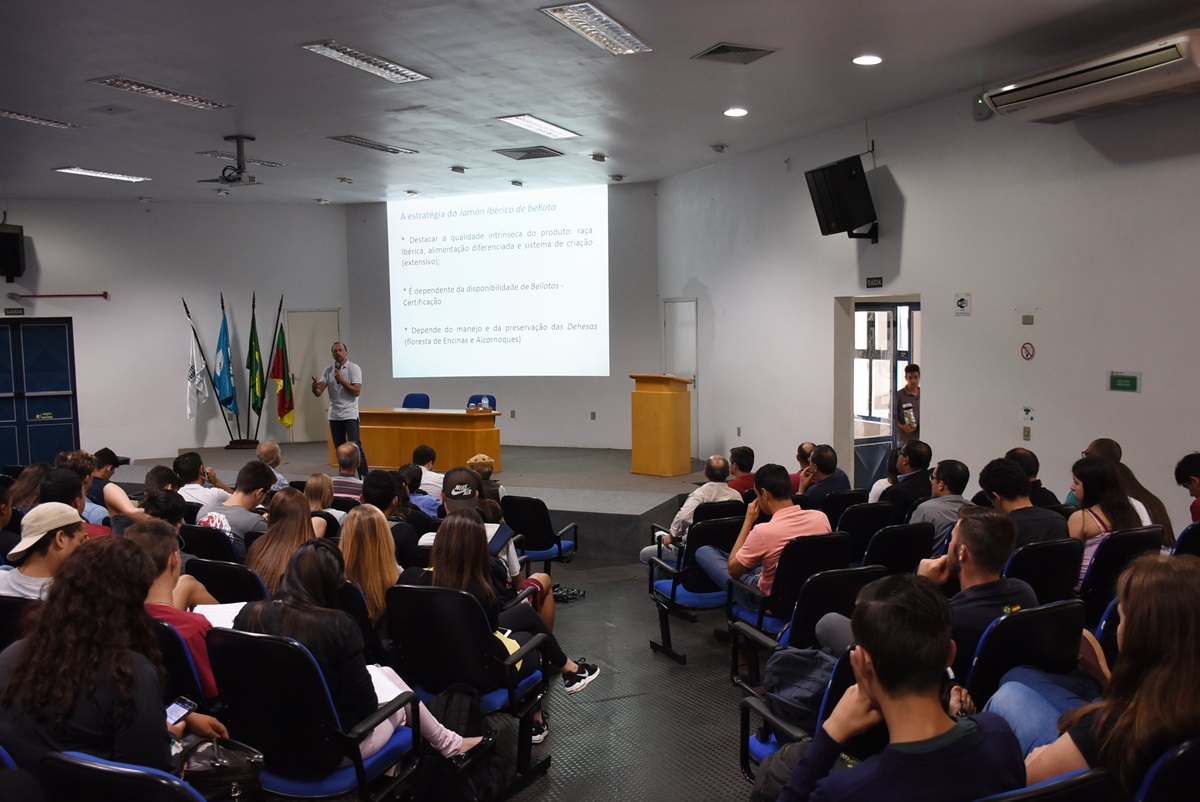 Em um segundo momento, o professor Adriano Garcia Rosado Júnior, do Campus SVS, abordou “Às denominações de origem como marca regional - O caso do presunto pata negra Espanhol”, compartilhando sua experiência na Espanha. Durante visita ao país, o professor teve a oportunidade de conhecer todo o processo de produção do presunto ibérico, desde a criação dos suínos até o balcão. Adriano destacou o potencial que produtos diferenciados, com características locais, podem ter no mercado; bastando incentivo, pesquisa, atitude e criatividade para tornar isso uma realidade para o mercado nacional (no Brasil, há 49 produtos com denominação de origem ou marca local/regional ).