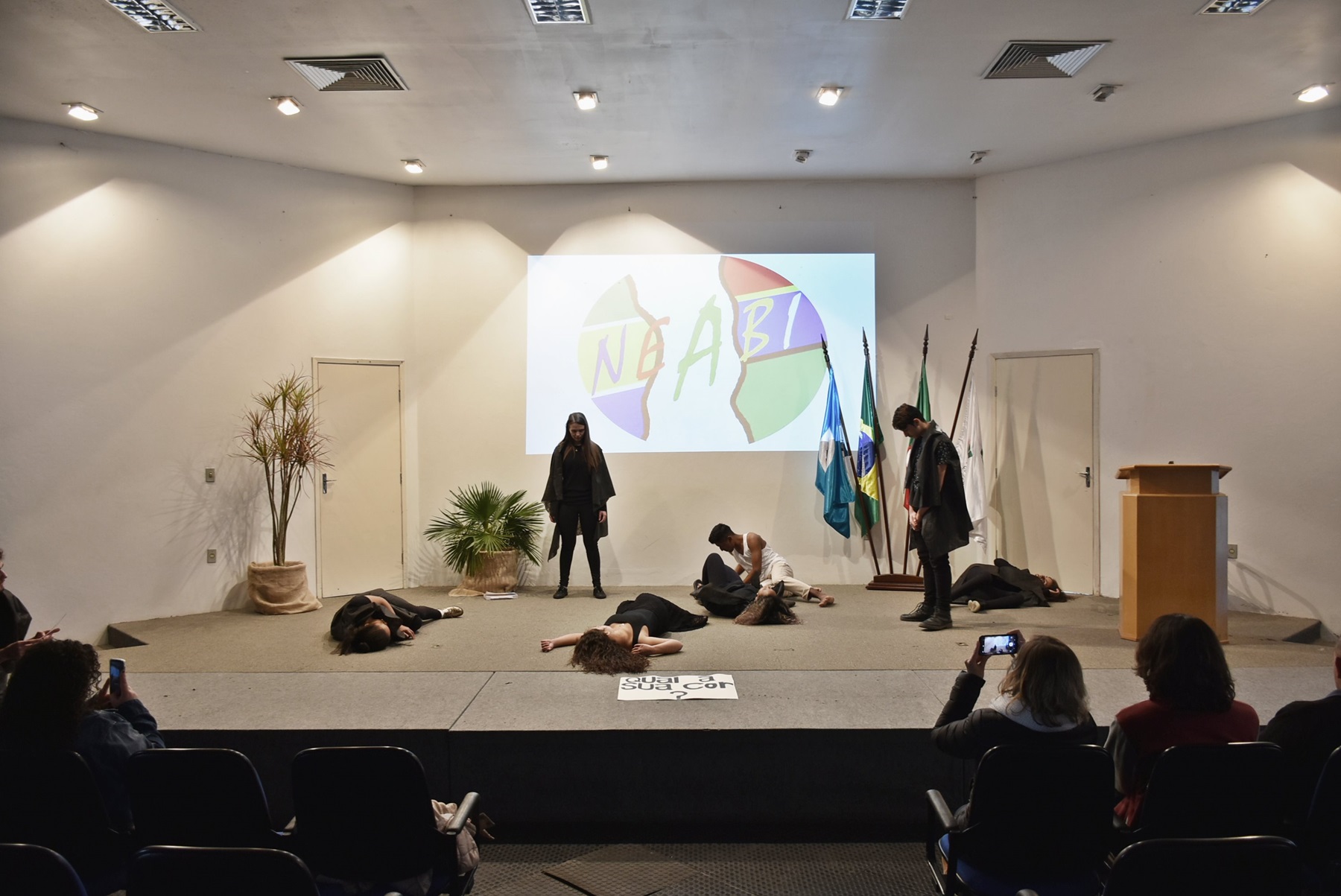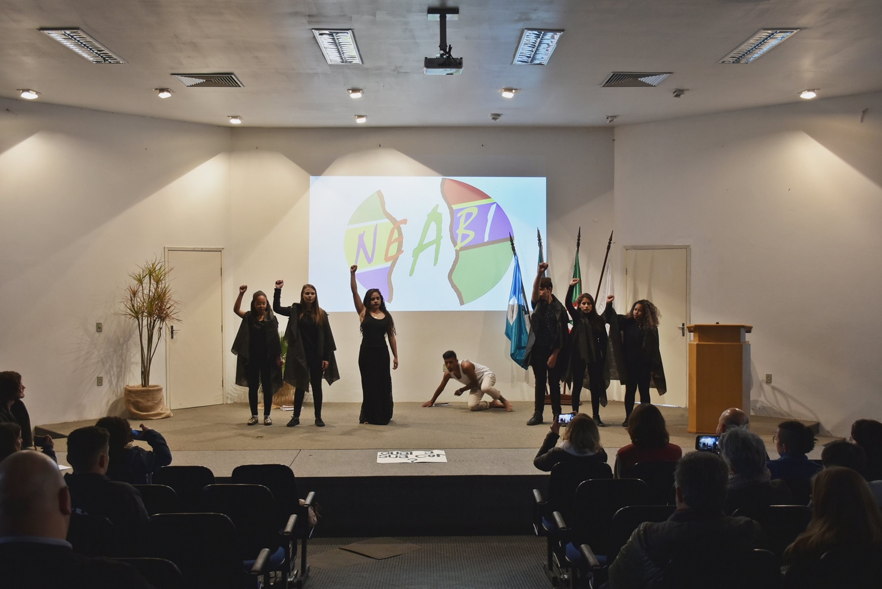 Na abertura do evento, houve apresentação cultural do Núcleo de Estudos Afro-brasileiros e Indígenas (NEABI), com a teatralização do poema “Gritaram-me negra”, da afro peruana Victoria Santa Cruz.