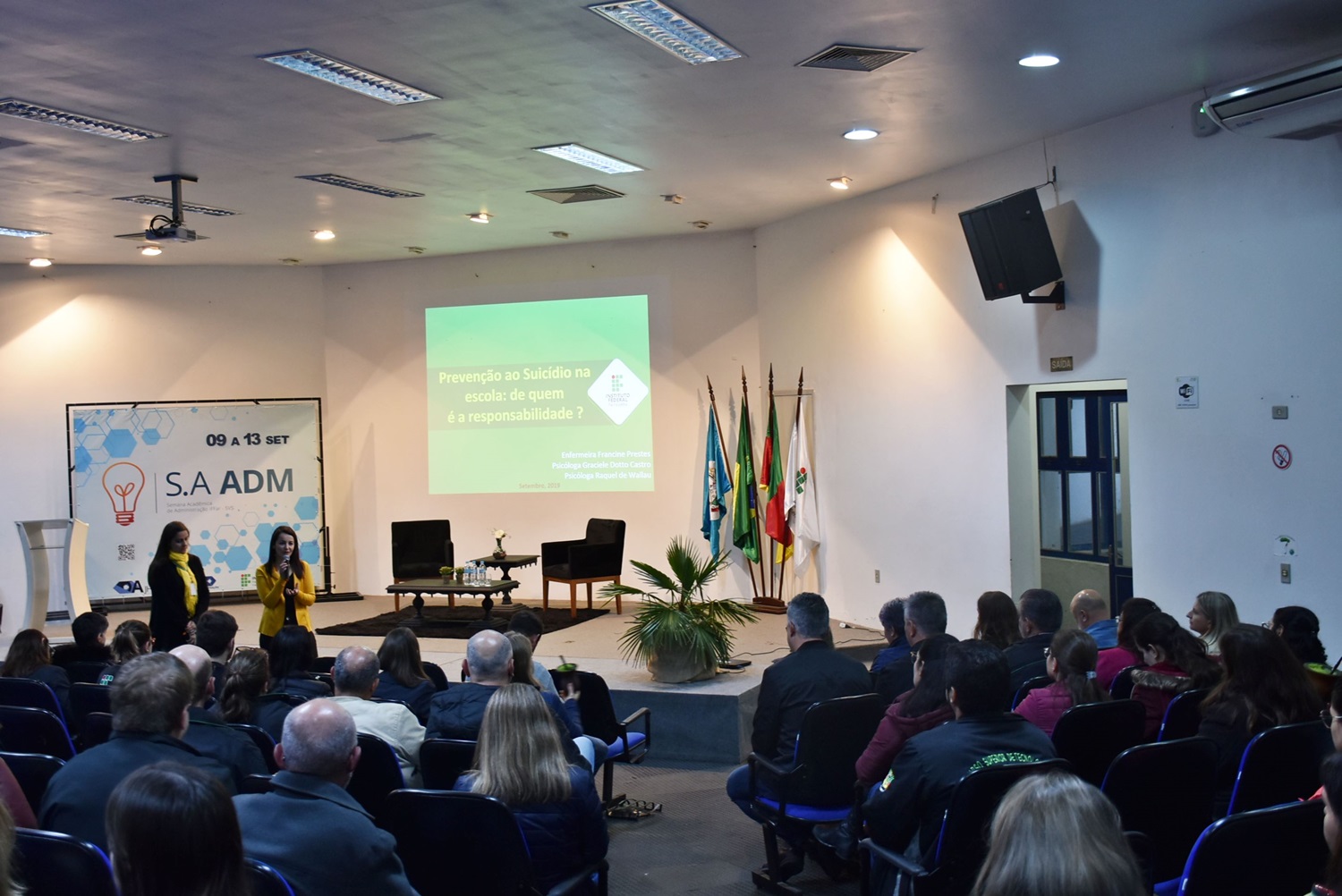 Na tarde do dia 11 de setembro, quarta-feira, técnicos-administrativos e docentes do Instituto Federal Farroupilha – Campus São Vicente do Sul participaram da formação “Prevenção ao suicídio na escola: de quem é a responsabilidade?”, que teve o objetivo de aumentar a compreensão dos servidores em relação ao fatores de risco e de proteção ao suicídio, além de engajar a todos em prol da valorização da vida. A atividade foi promovida pela Direção de Ensino em alusão ao Setembro Amarelo, campanha brasileira de prevenção ao suicídio, e ministrada pela psicóloga Graciele Dotto Castro e pela enfermeira Francine Cassol Prestes, ambas servidoras da instituição.
