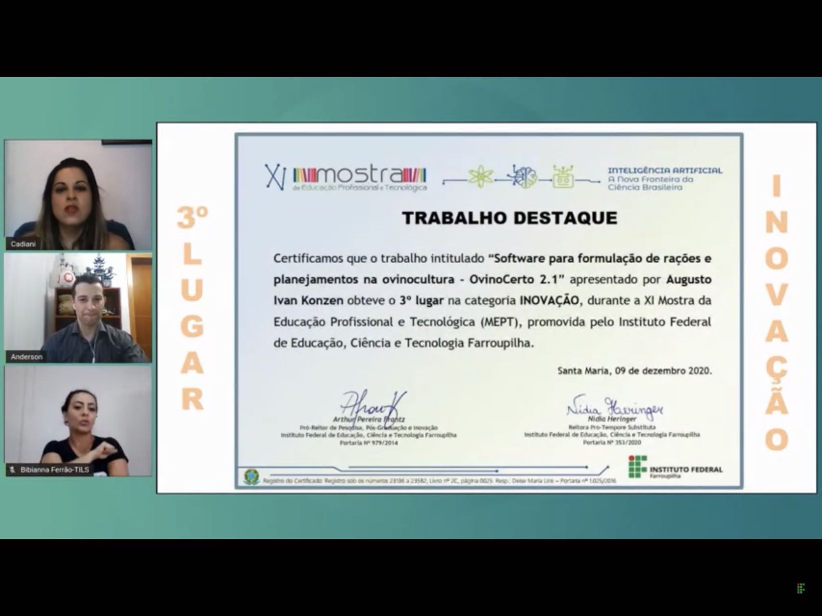 - 3º Lugar - "Software para formulação de rações e planejamentos na ovinocultura - OvinoCerto 2.1", do estudante Augusto Ivan Konzen e orientação dos professores Rafael Sanchez Venturini, Gustavo Rissetti e da professora Eliana Zen.