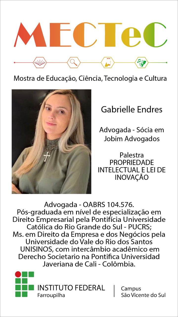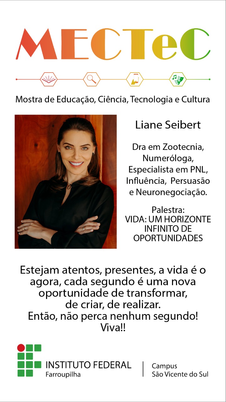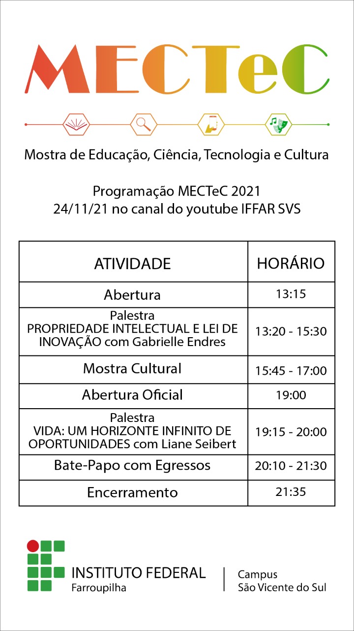 Na próxima quarta-feira, dia 24 de novembro, acontece a Mostra de Educação, Ciência, Tecnologia e Cultura (MECTeC) 2021, do Instituto Federal Farroupilha – Campus São Vicente do Sul. O tema da mostra deste ano é “Ciência, tecnologia, inovação e a transversalidade em tempo de pandemia”.