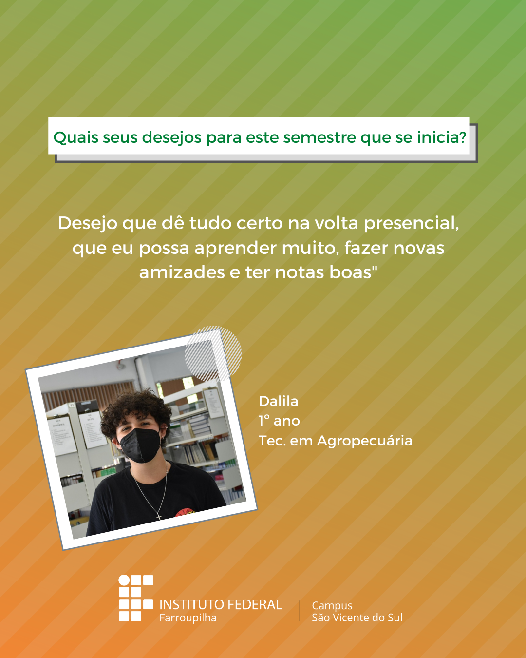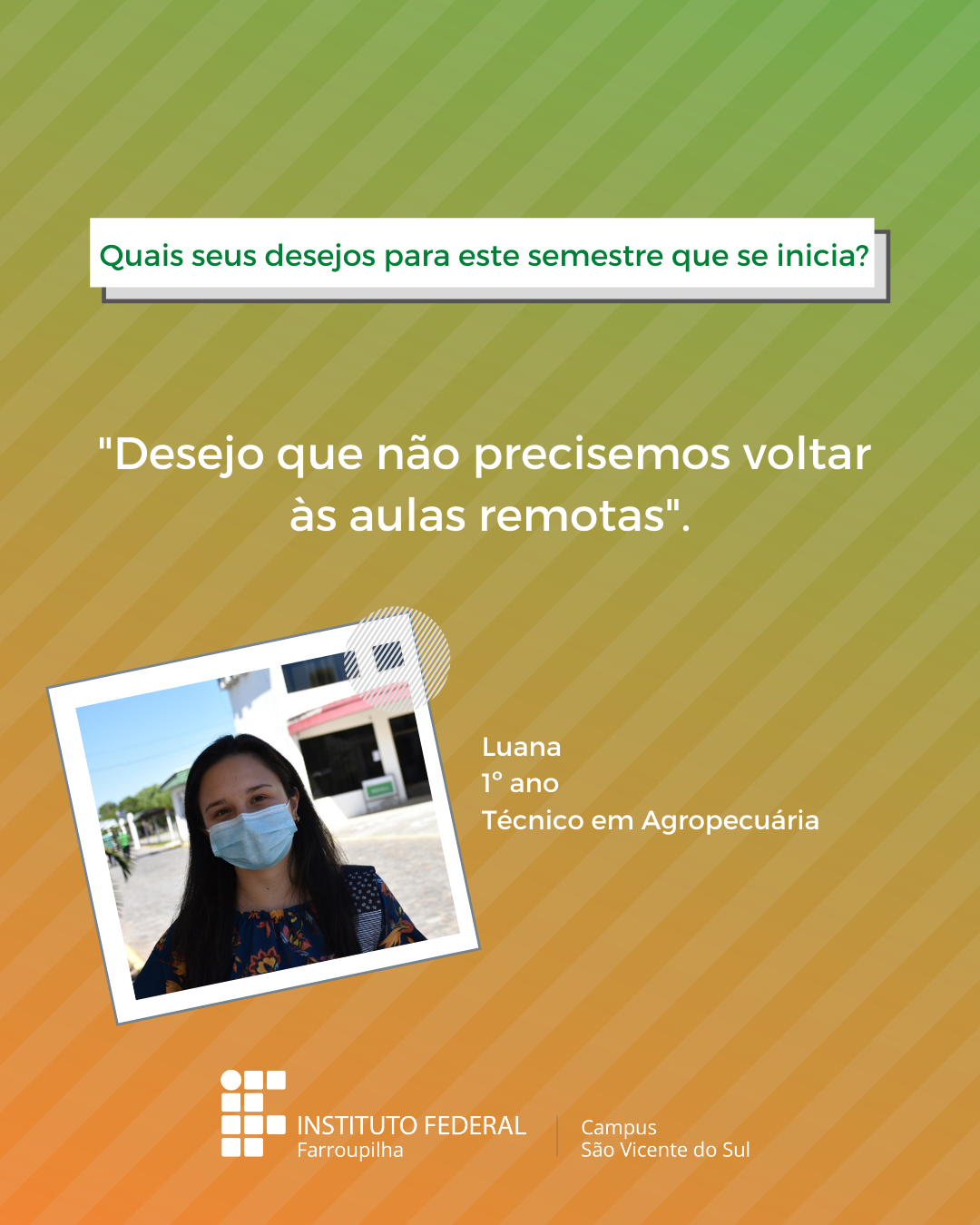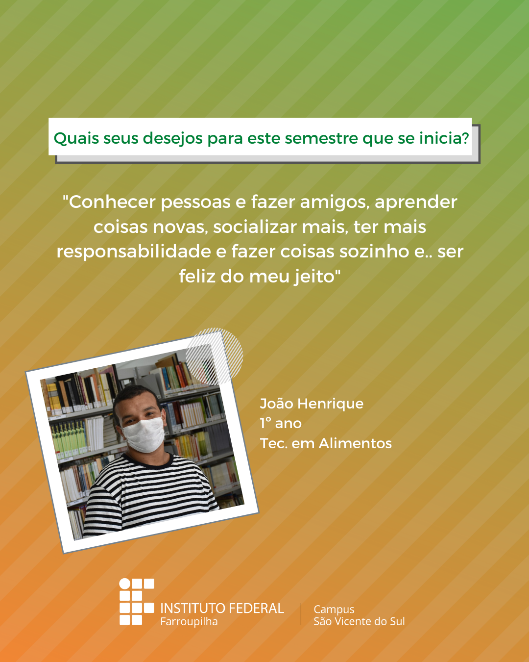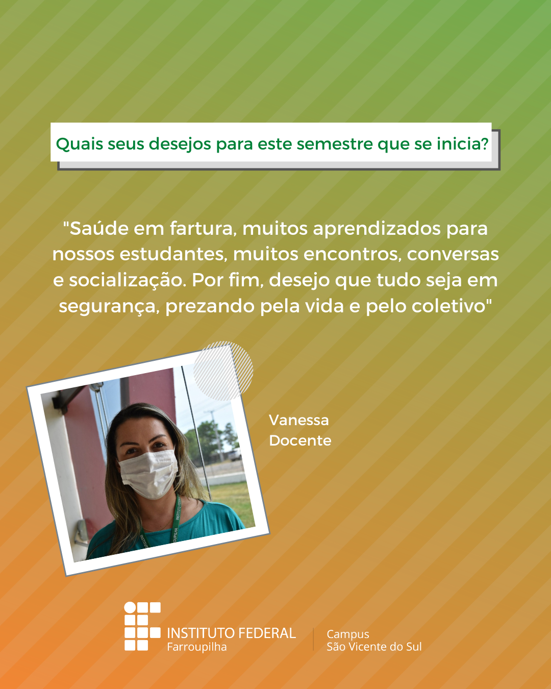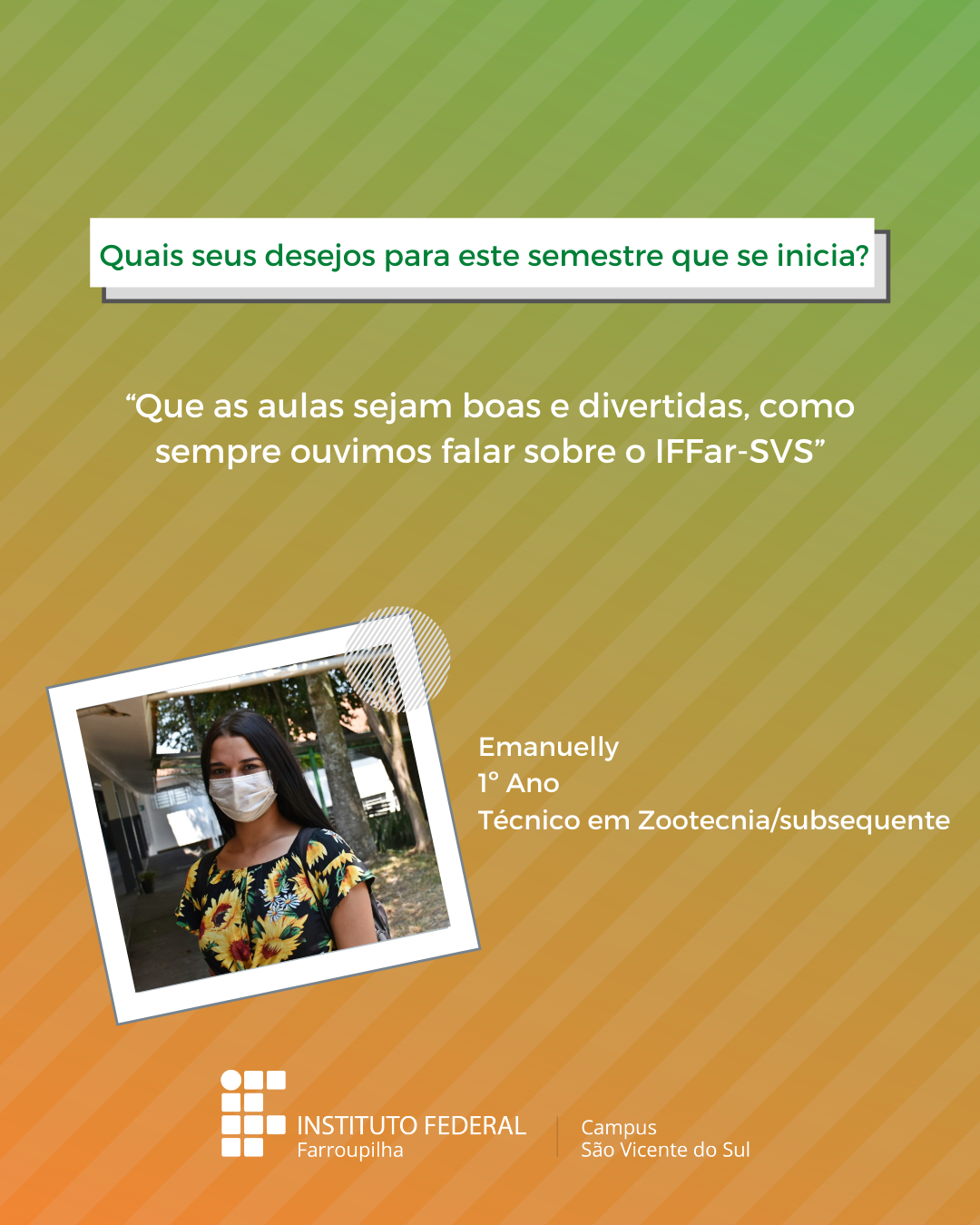 A volta das atividades presenciais no IFFar-São Vicente do Sul foi um momento muito esperado por todos aqueles que frequentavam diariamente o campus e também para quem ainda não havia tido a possibilidade de desenvolver suas atividades presencialmente. Com o objetivo de celebrar e dar voz à nossa comunidade neste momento tão aguardado, foi realizada a campanha ALEGRIAS & DESEJOS, onde perguntamos para estudantes, servidores(as) e terceirizados(as) sobre as suas maiores alegrias em voltar presencialmente ao campus e quais os desejos para este semestre que tinha acabado de iniciar.