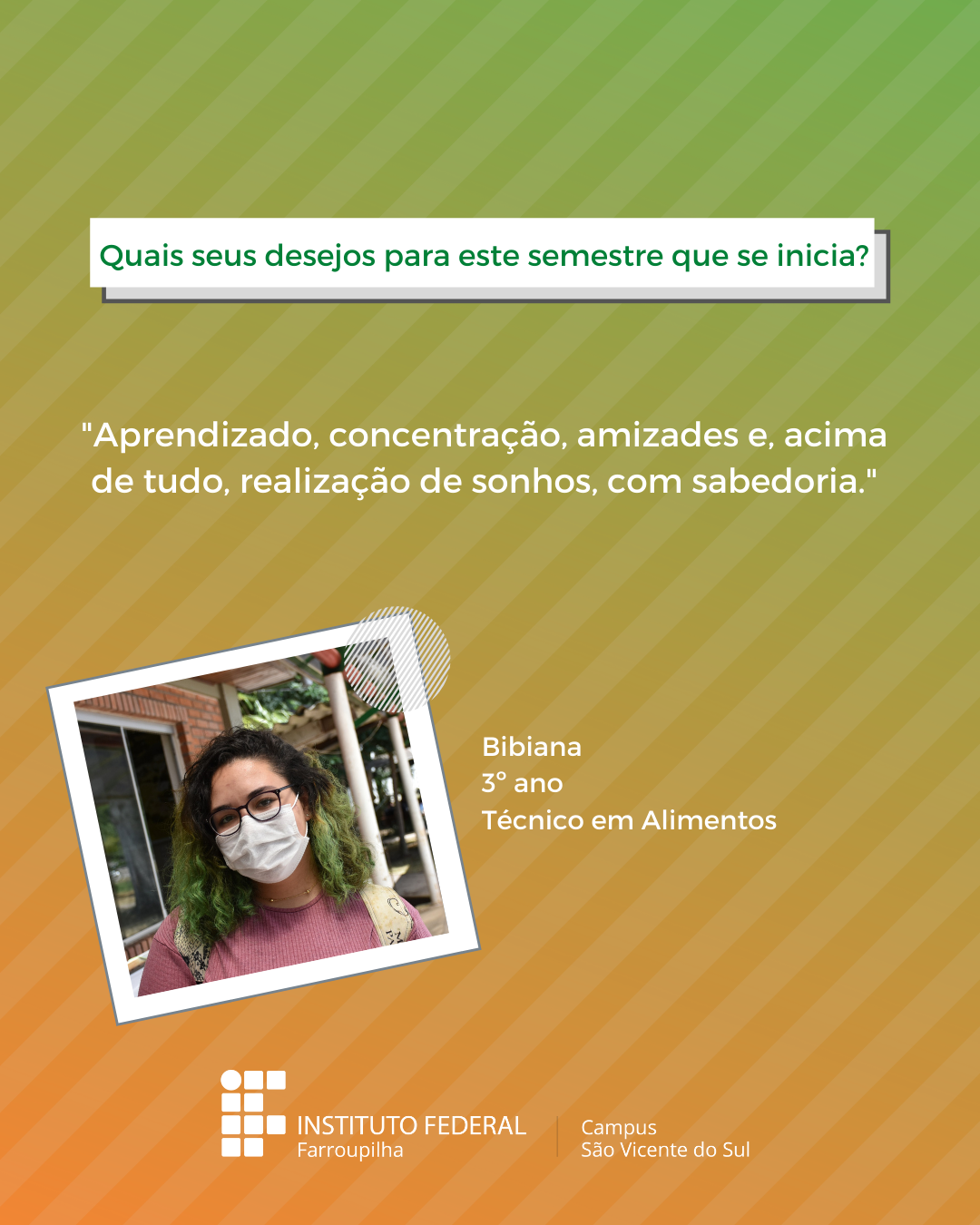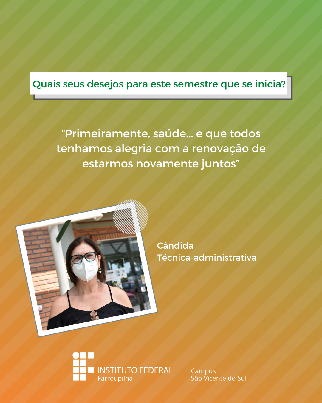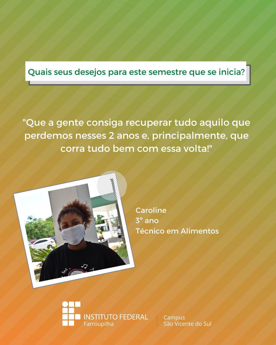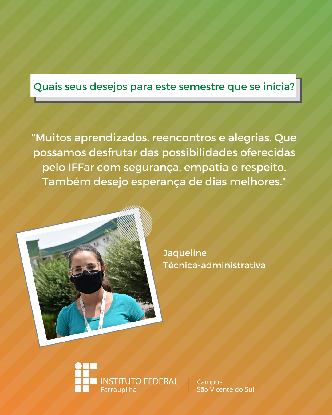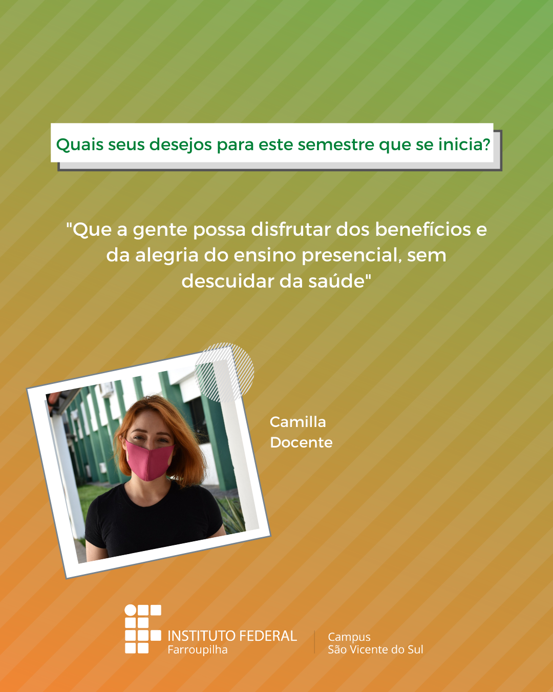 A volta das atividades presenciais no IFFar-São Vicente do Sul foi um momento muito esperado por todos aqueles que frequentavam diariamente o campus e também para quem ainda não havia tido a possibilidade de desenvolver suas atividades presencialmente. Com o objetivo de celebrar e dar voz à nossa comunidade neste momento tão aguardado, foi realizada a campanha ALEGRIAS & DESEJOS, onde perguntamos para estudantes, servidores(as) e terceirizados(as) sobre as suas maiores alegrias em voltar presencialmente ao campus e quais os desejos para este semestre que tinha acabado de iniciar.
