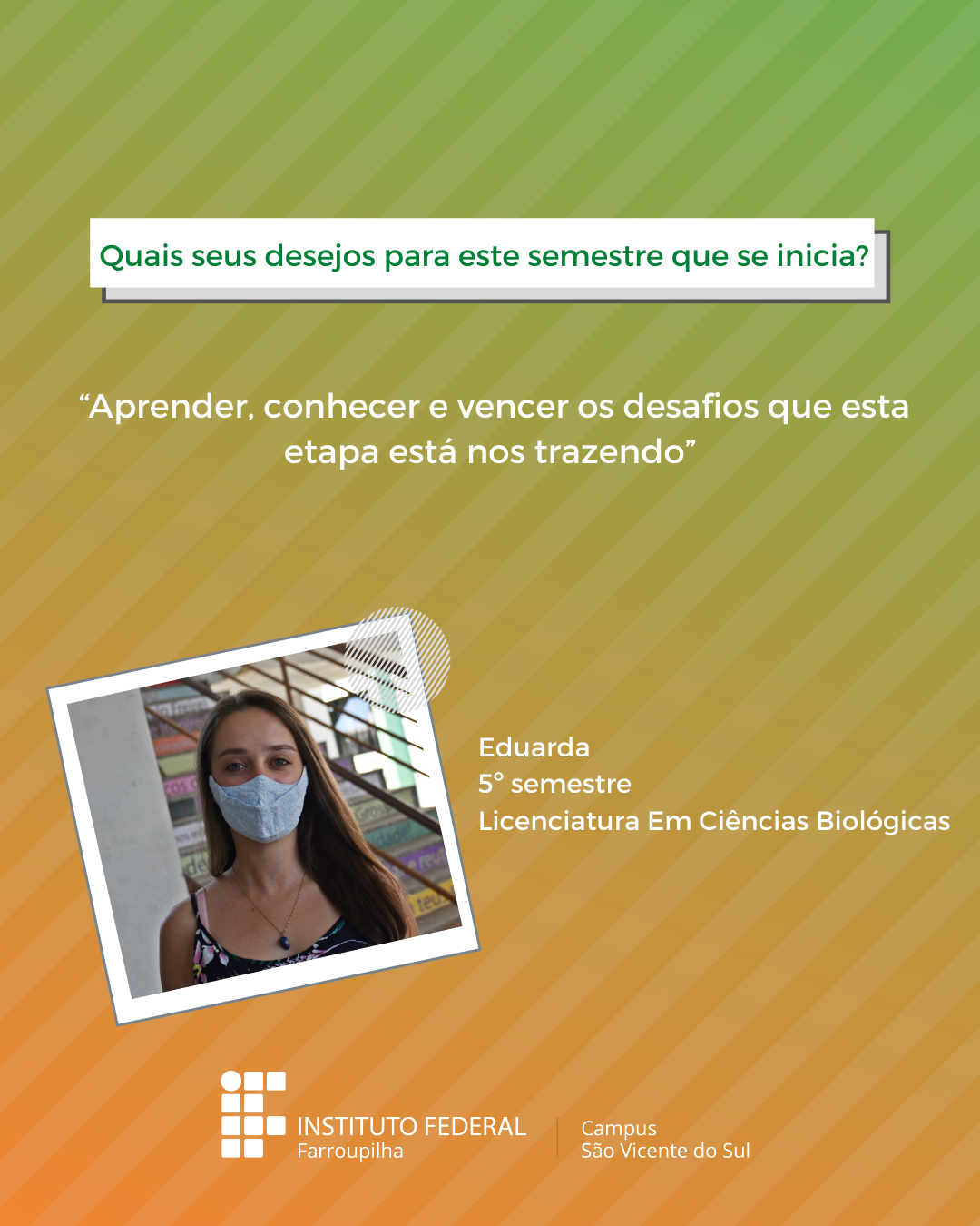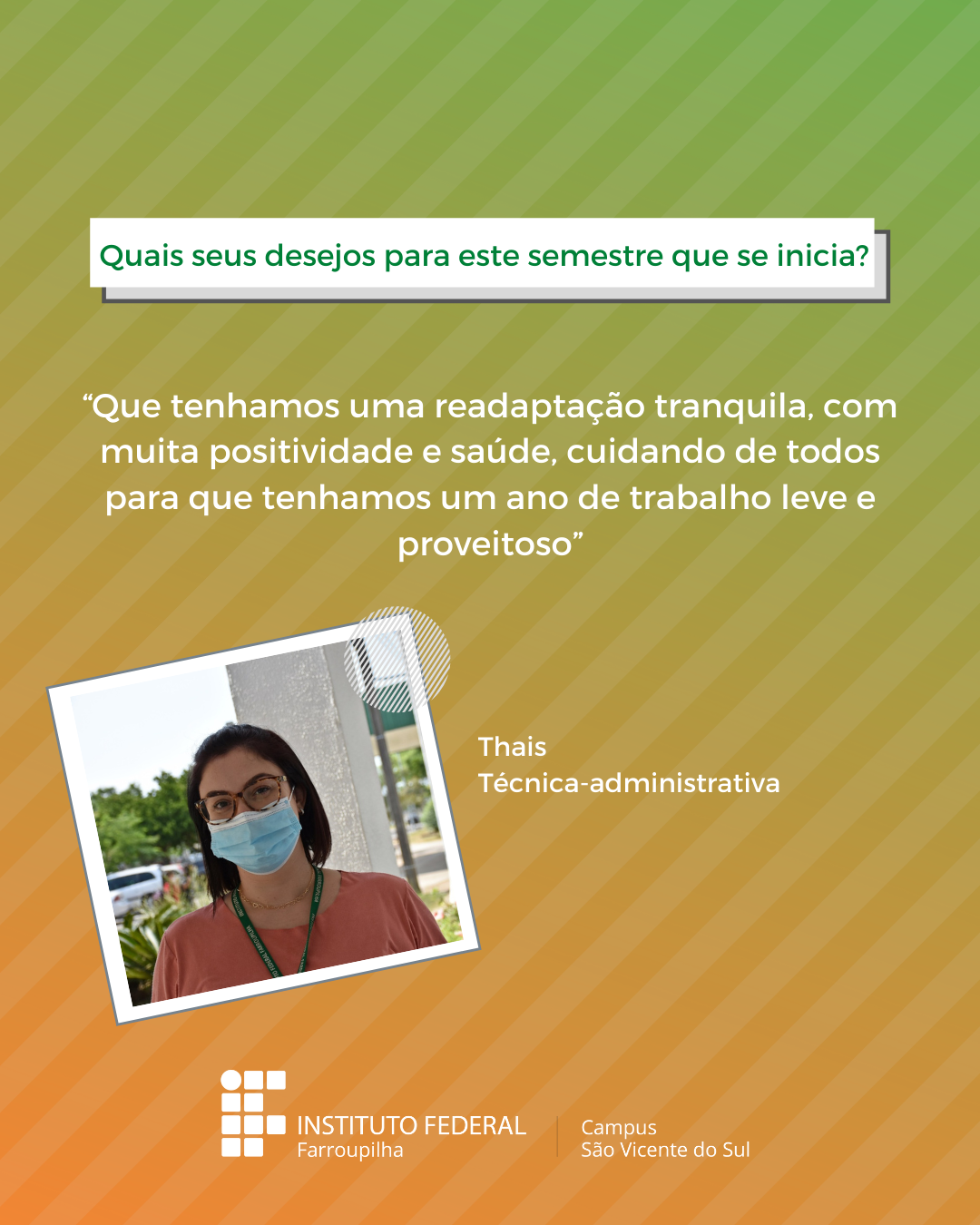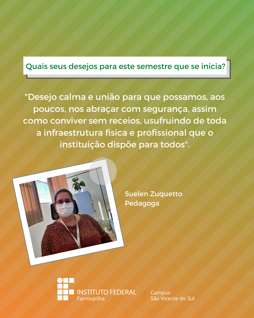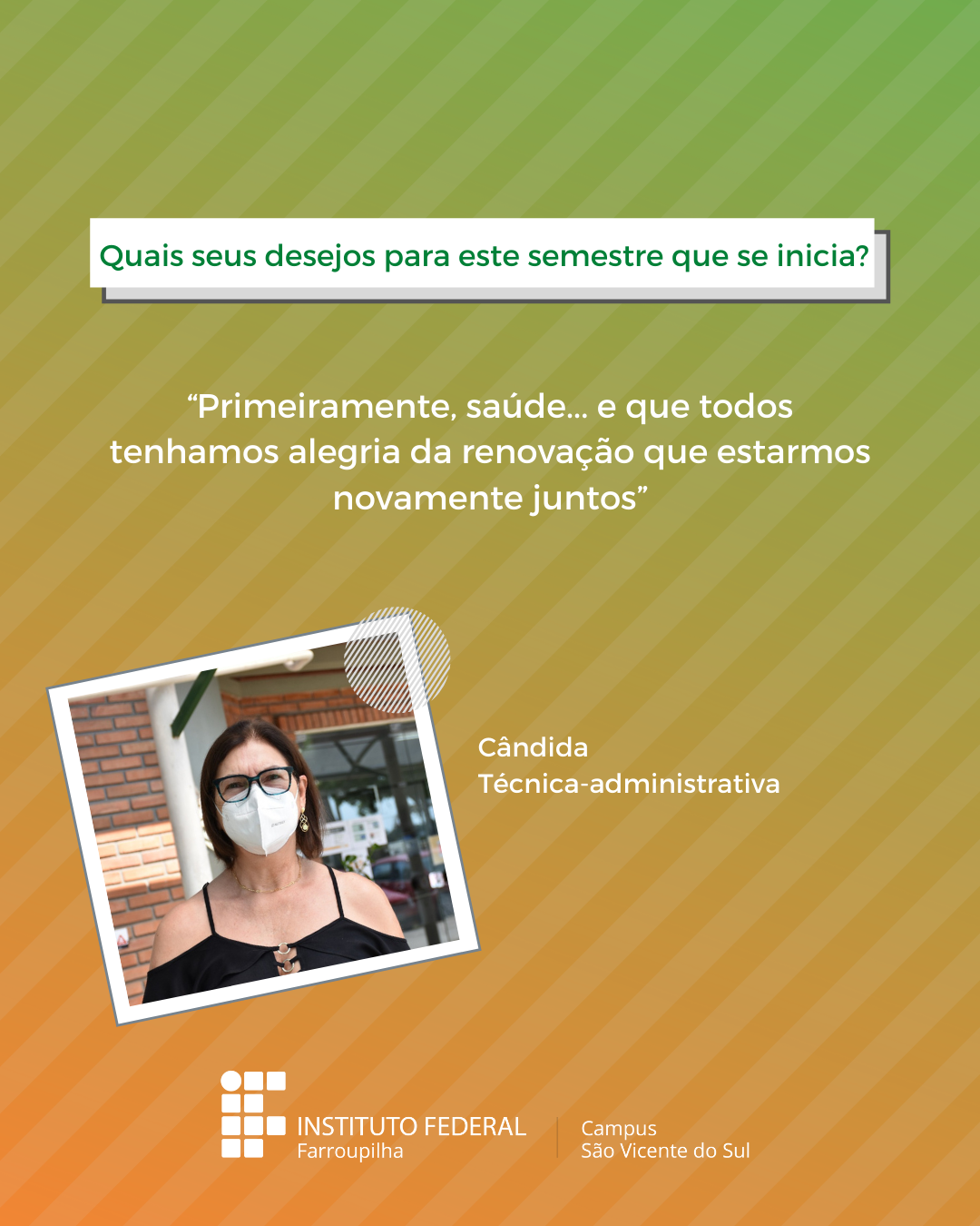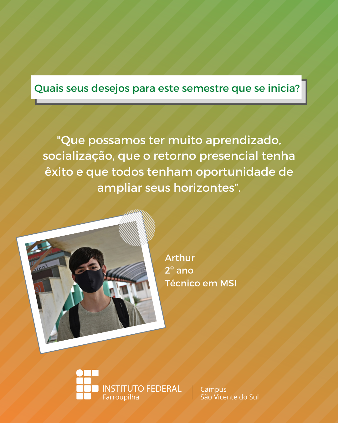 A volta das atividades presenciais no IFFar-São Vicente do Sul foi um momento muito esperado por todos aqueles que frequentavam diariamente o campus e também para quem ainda não havia tido a possibilidade de desenvolver suas atividades presencialmente. Com o objetivo de celebrar e dar voz à nossa comunidade neste momento tão aguardado, foi realizada a campanha ALEGRIAS & DESEJOS, onde perguntamos para estudantes, servidores(as) e terceirizados(as) sobre as suas maiores alegrias em voltar presencialmente ao campus e quais os desejos para este semestre que tinha acabado de iniciar.