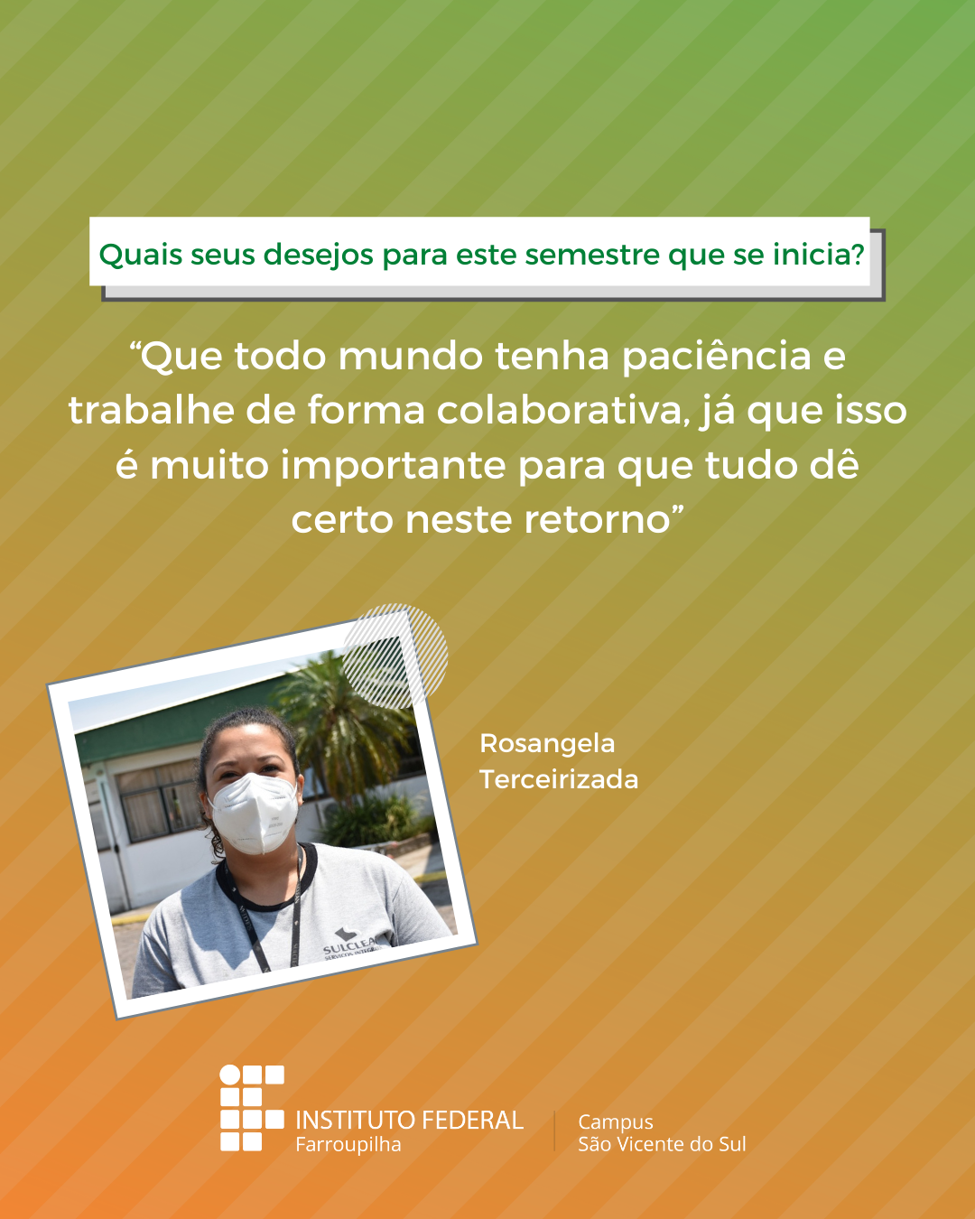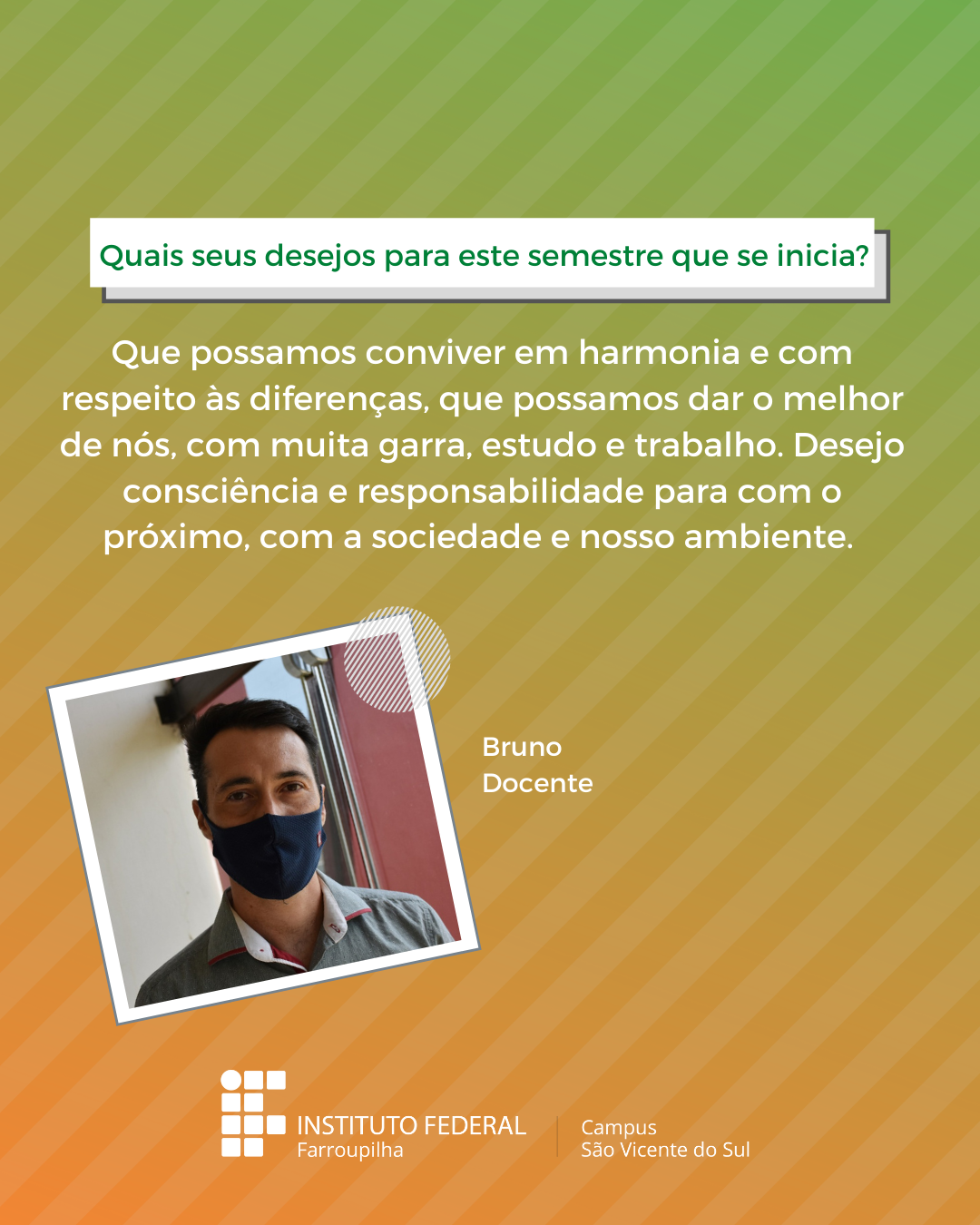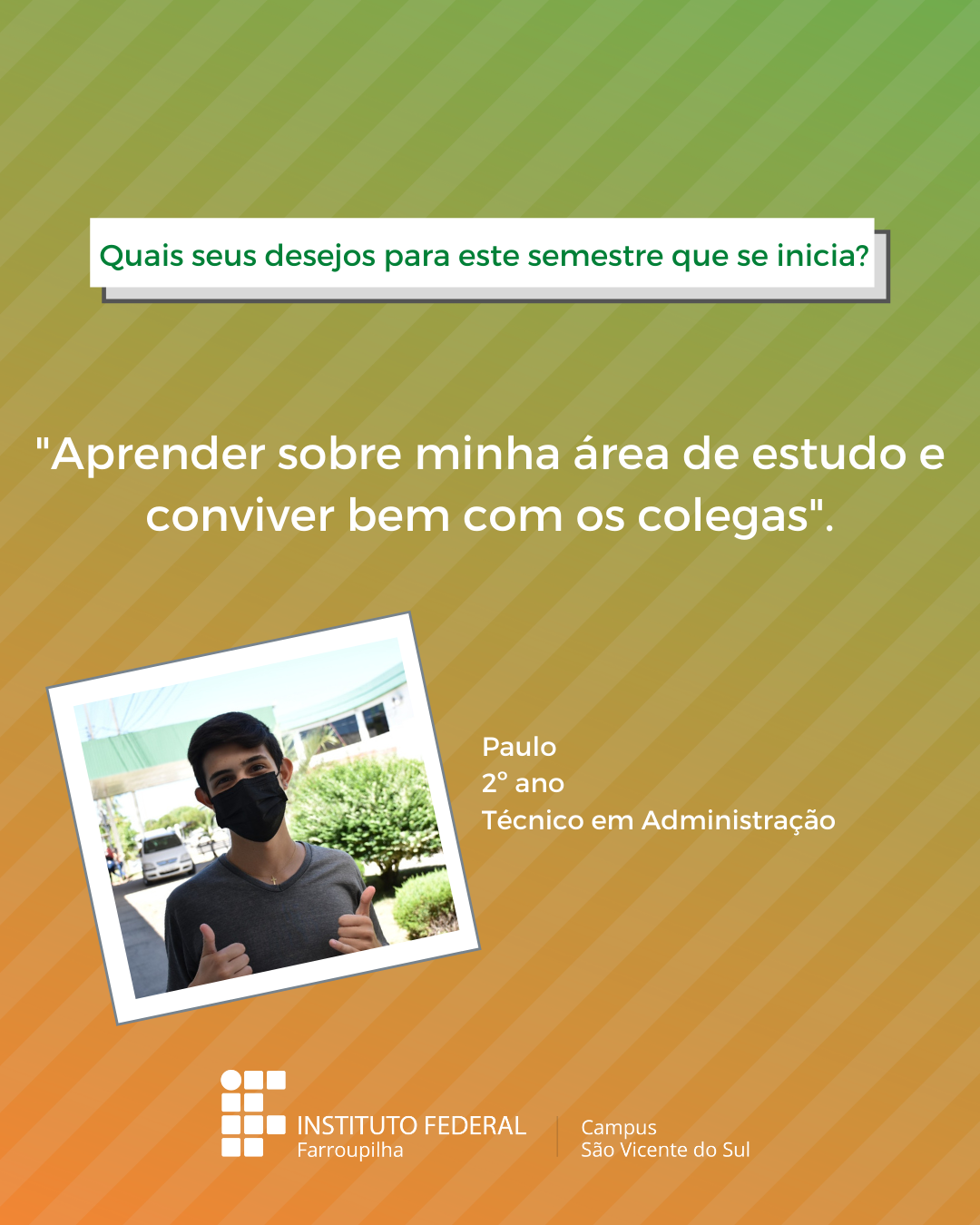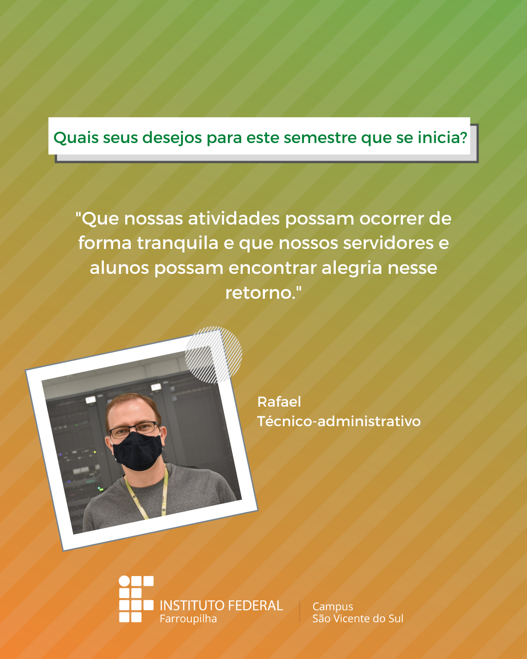 A volta das atividades presenciais no IFFar-São Vicente do Sul foi um momento muito esperado por todos aqueles que frequentavam diariamente o campus e também para quem ainda não havia tido a possibilidade de desenvolver suas atividades presencialmente. Com o objetivo de celebrar e dar voz à nossa comunidade neste momento tão aguardado, foi realizada a campanha ALEGRIAS & DESEJOS, onde perguntamos para estudantes, servidores(as) e terceirizados(as) sobre as suas maiores alegrias em voltar presencialmente ao campus e quais os desejos para este semestre que tinha acabado de iniciar.