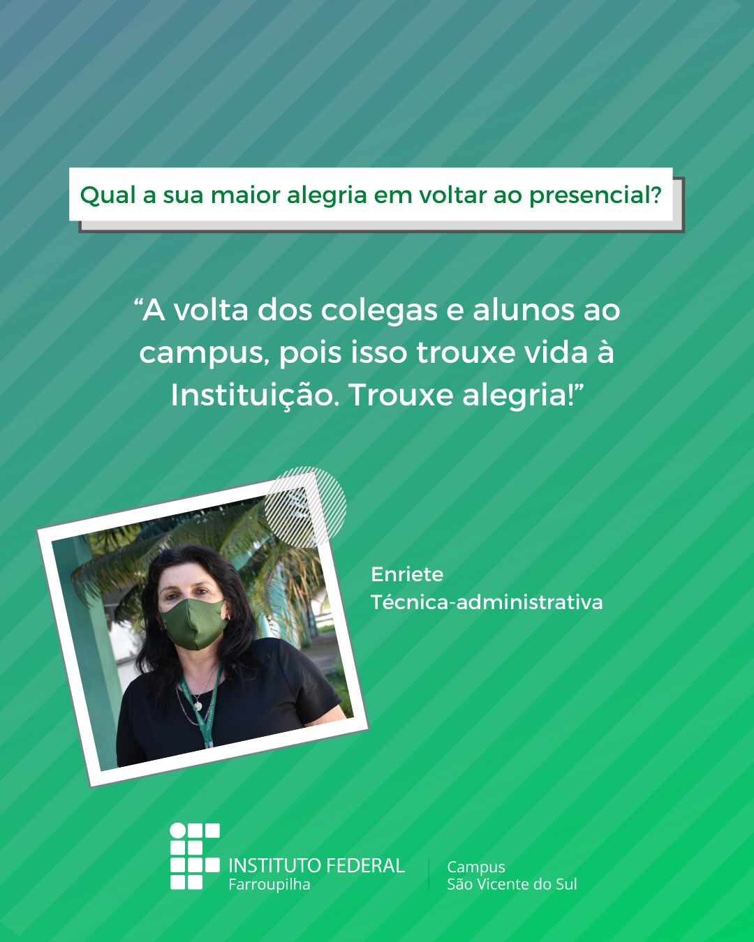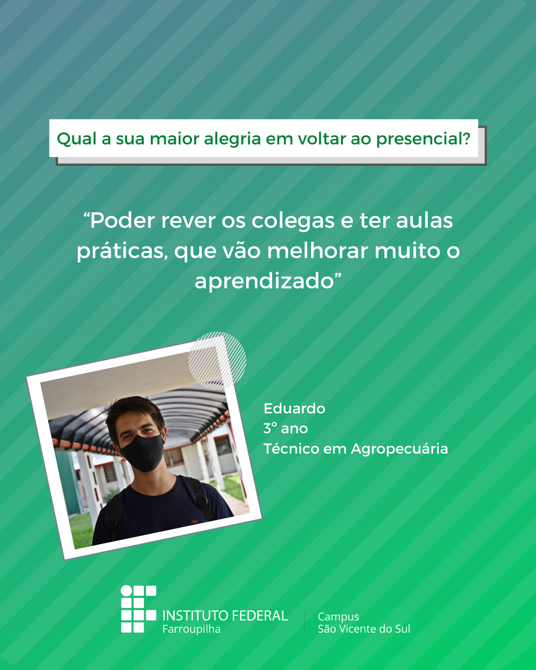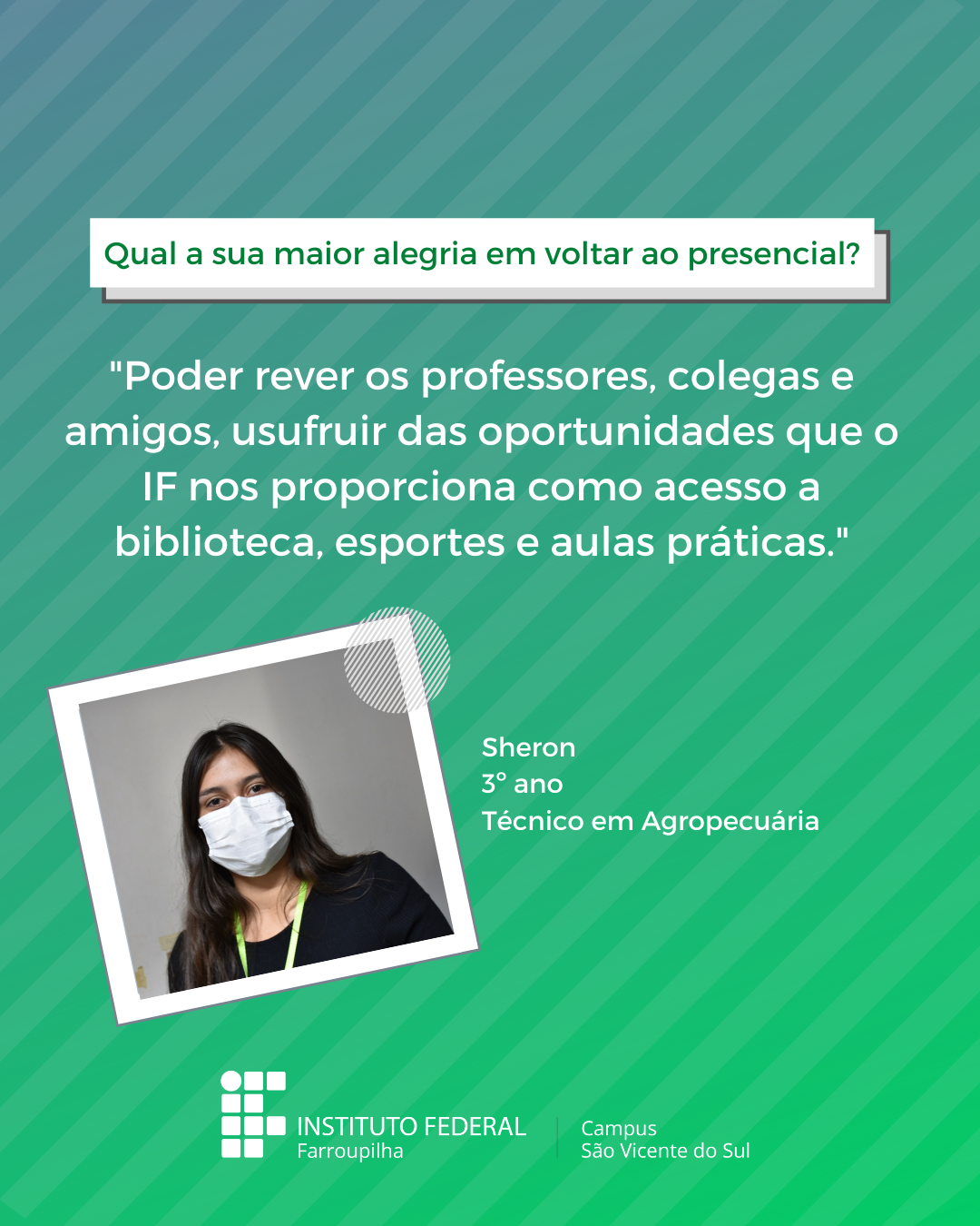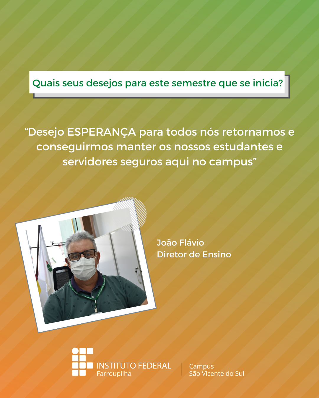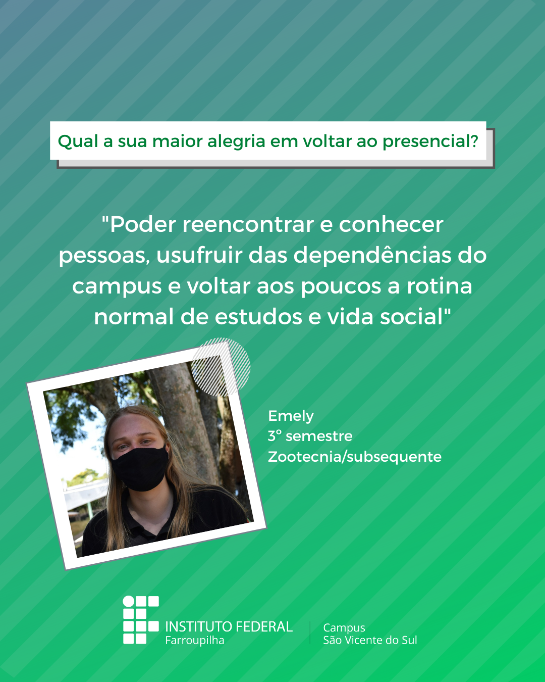 A volta das atividades presenciais no IFFar-São Vicente do Sul foi um momento muito esperado por todos aqueles que frequentavam diariamente o campus e também para quem ainda não havia tido a possibilidade de desenvolver suas atividades presencialmente. Com o objetivo de celebrar e dar voz à nossa comunidade neste momento tão aguardado, foi realizada a campanha ALEGRIAS & DESEJOS, onde perguntamos para estudantes, servidores(as) e terceirizados(as) sobre as suas maiores alegrias em voltar presencialmente ao campus e quais os desejos para este semestre que tinha acabado de iniciar.