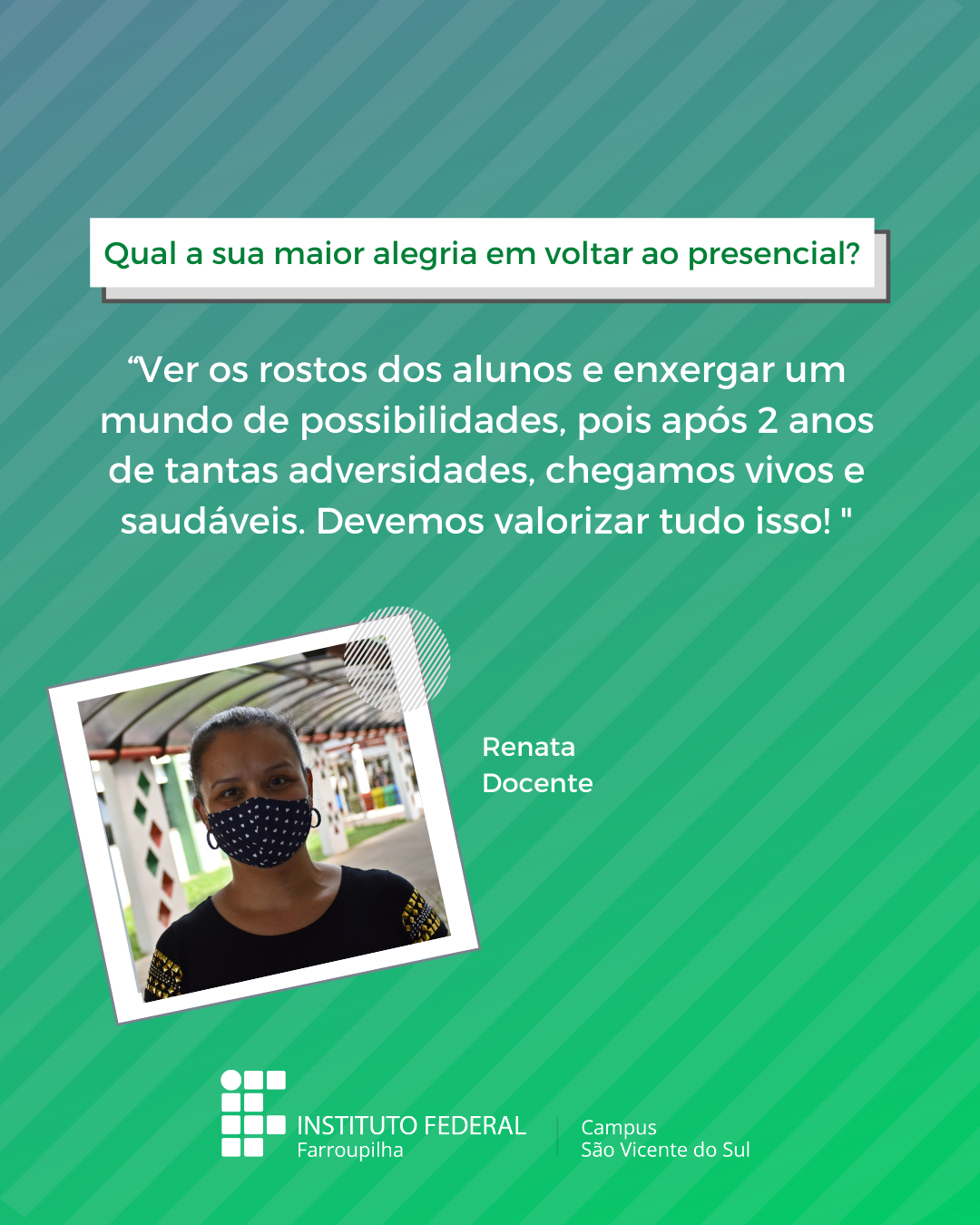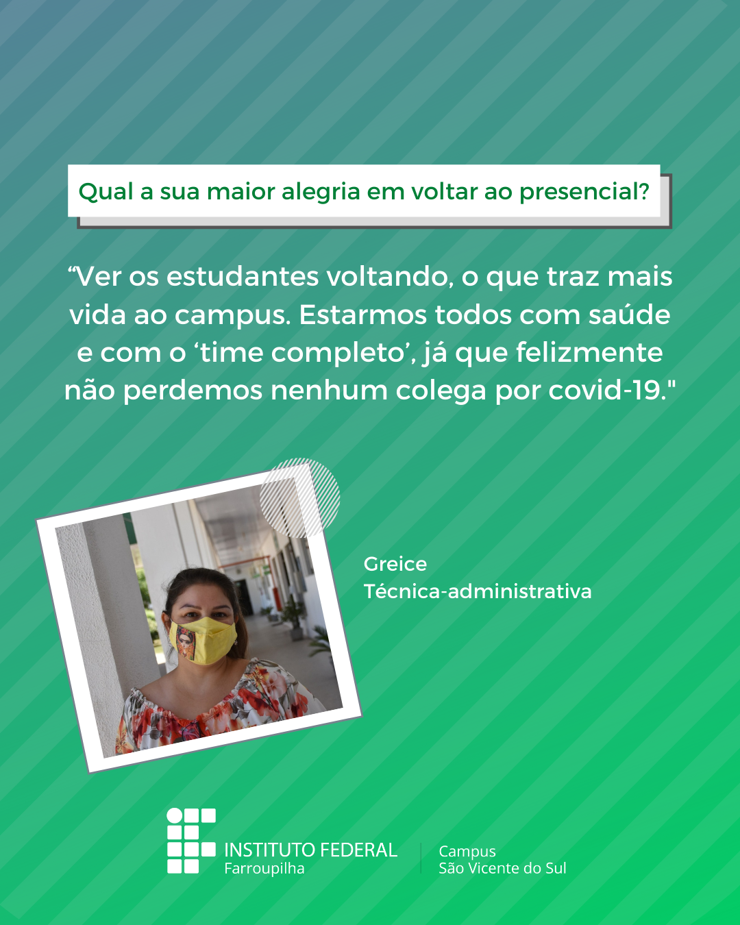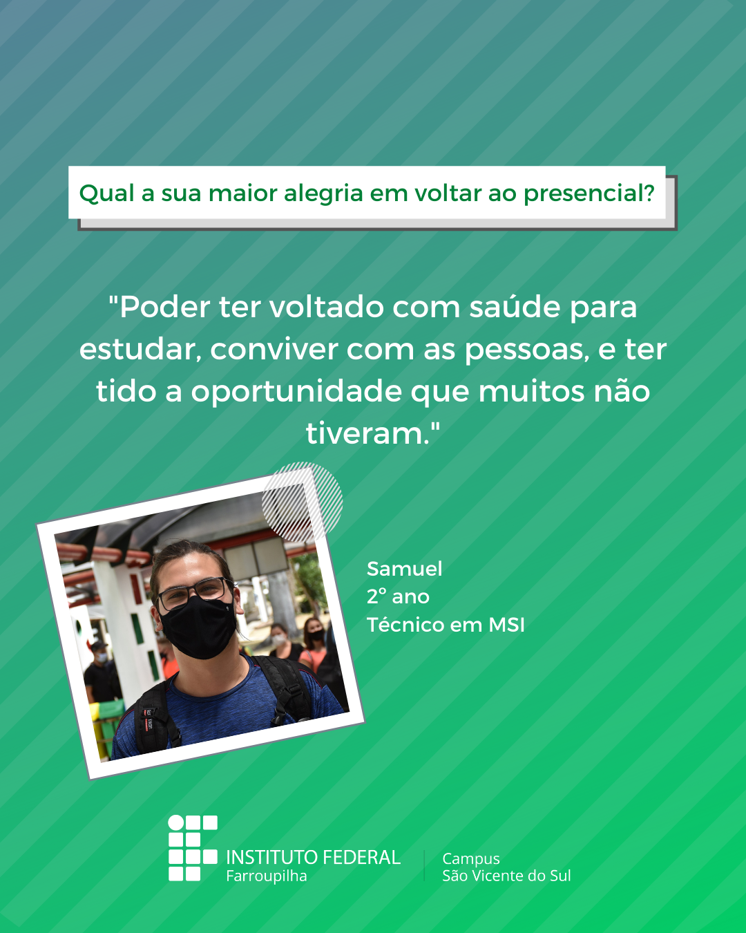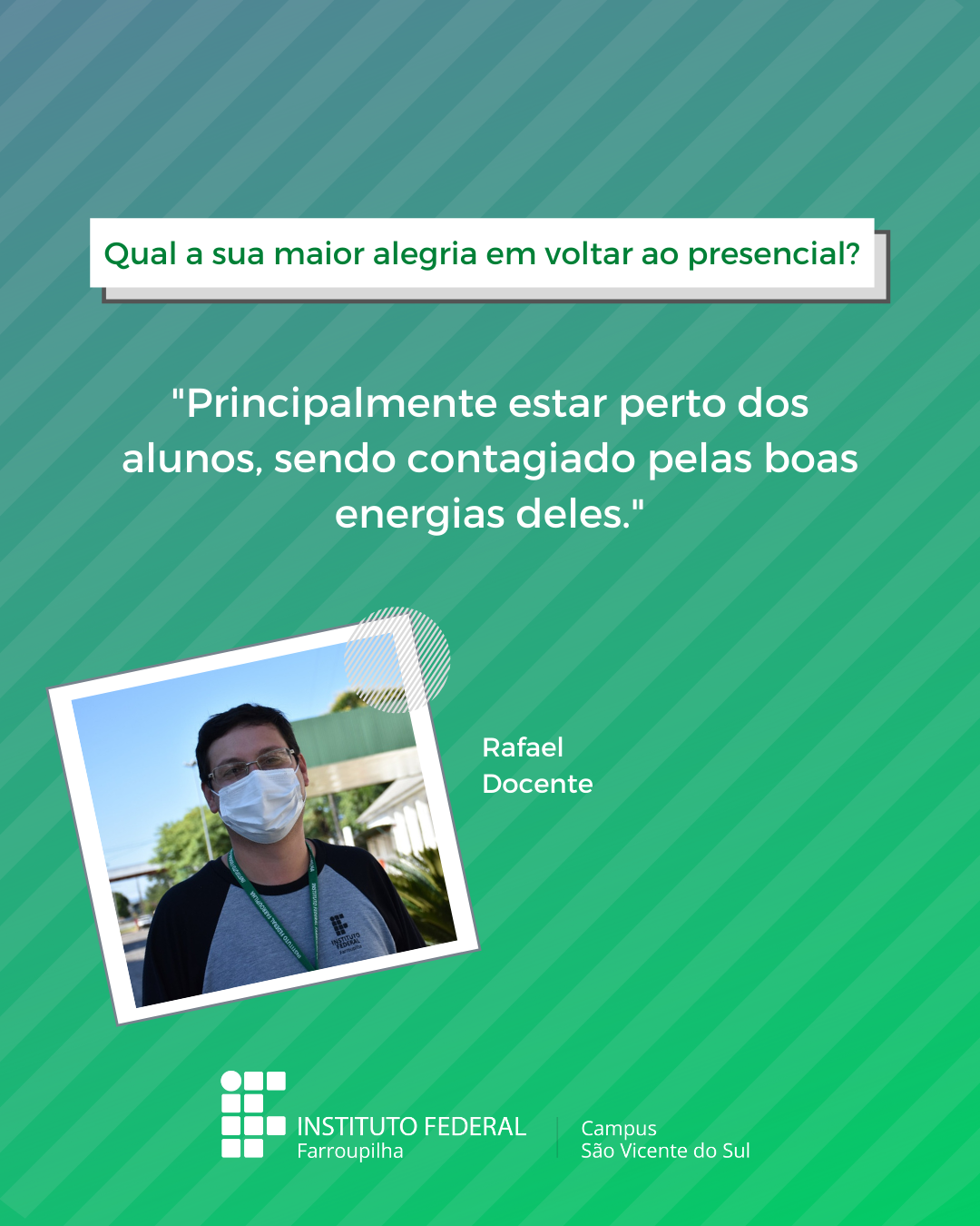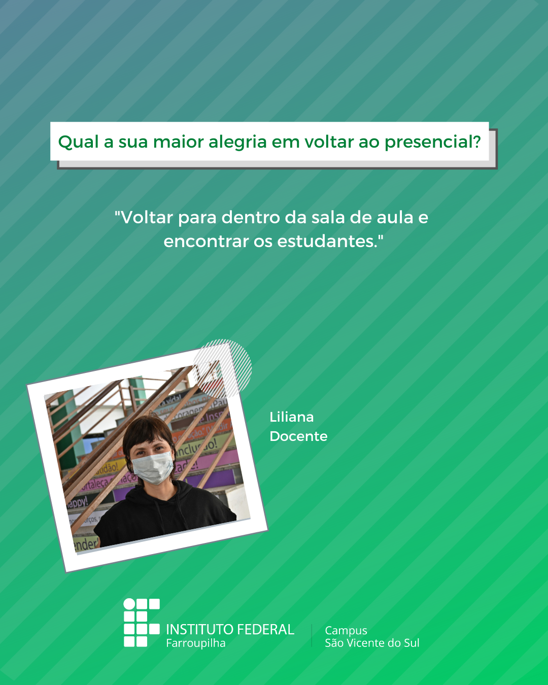 A volta das atividades presenciais no IFFar-São Vicente do Sul foi um momento muito esperado por todos aqueles que frequentavam diariamente o campus e também para quem ainda não havia tido a possibilidade de desenvolver suas atividades presencialmente. Com o objetivo de celebrar e dar voz à nossa comunidade neste momento tão aguardado, foi realizada a campanha ALEGRIAS & DESEJOS, onde perguntamos para estudantes, servidores(as) e terceirizados(as) sobre as suas maiores alegrias em voltar presencialmente ao campus e quais os desejos para este semestre que tinha acabado de iniciar.