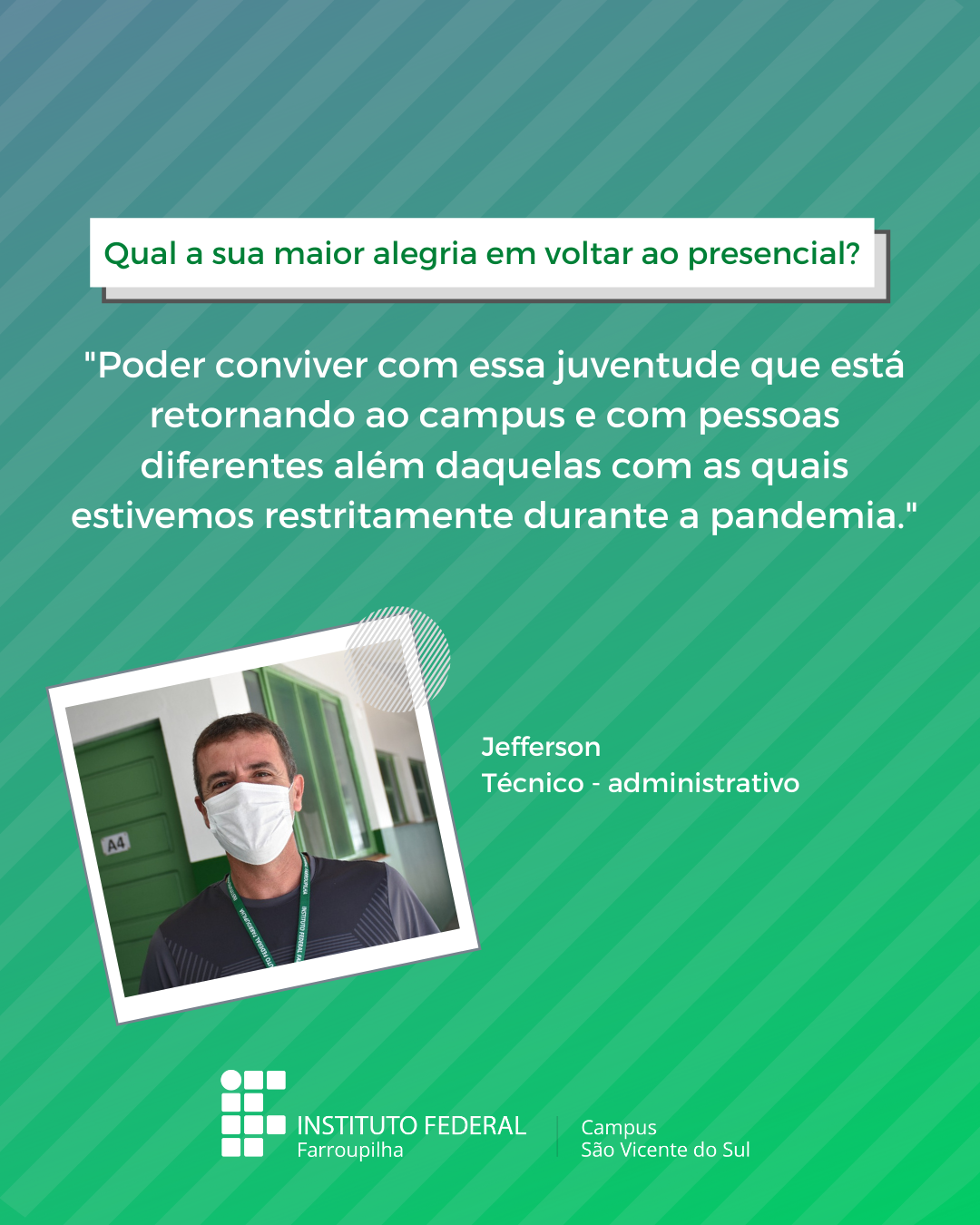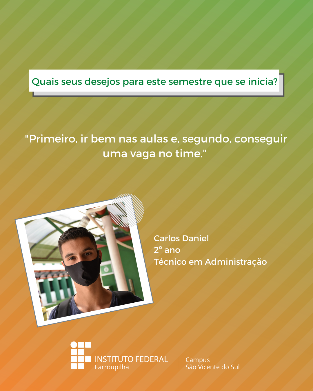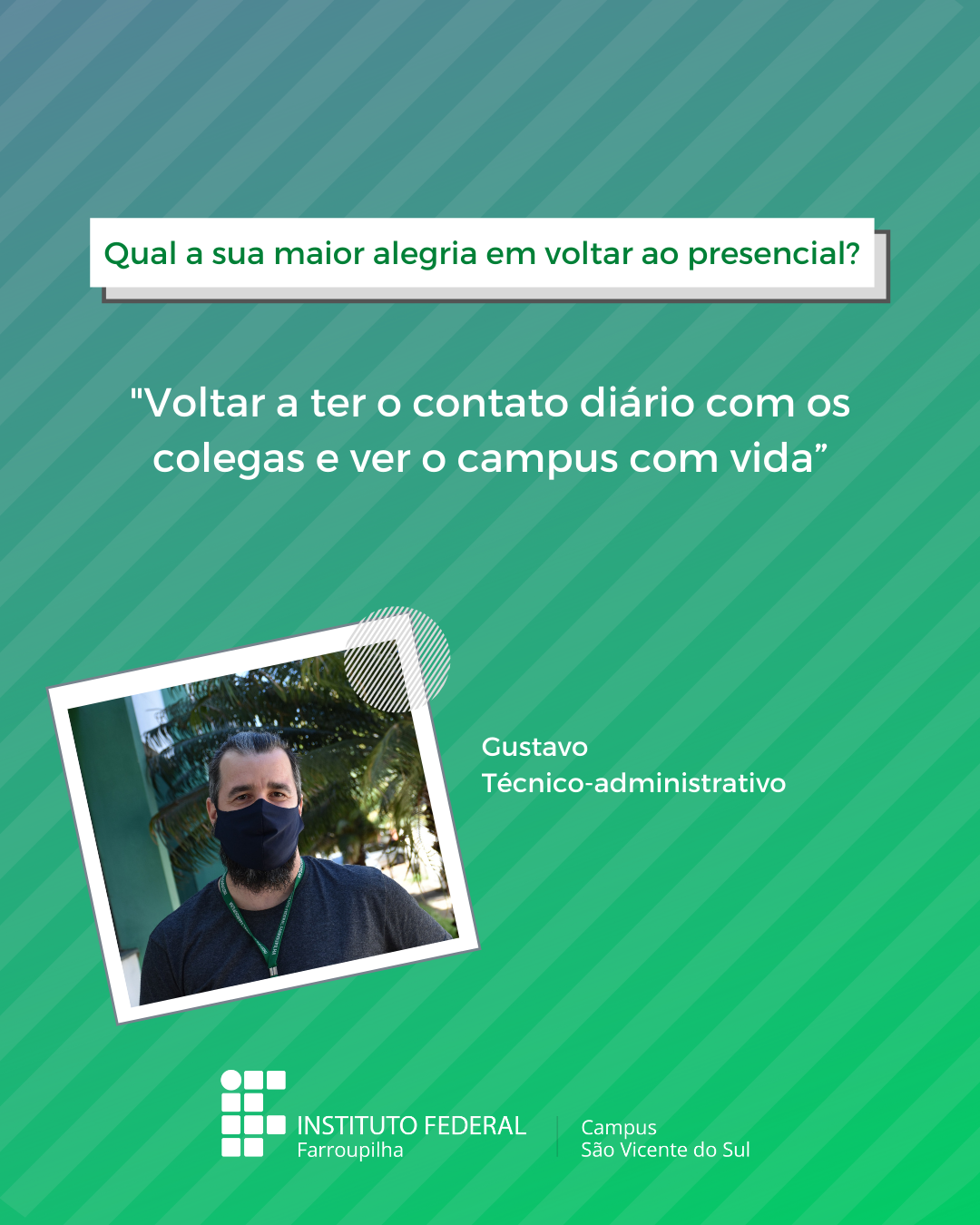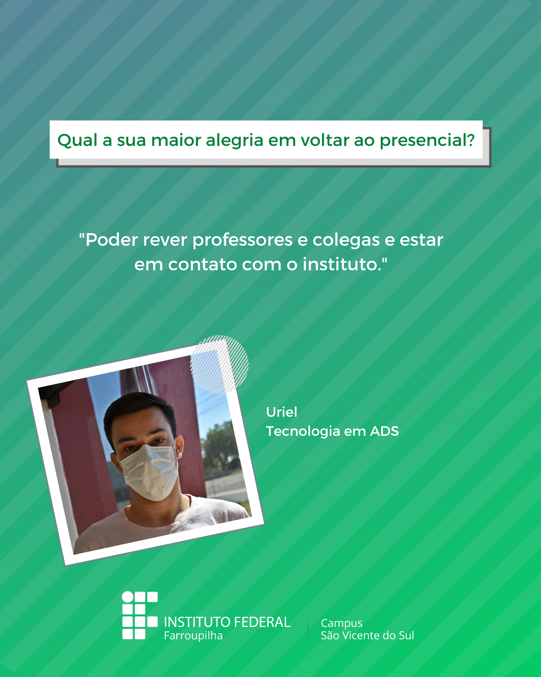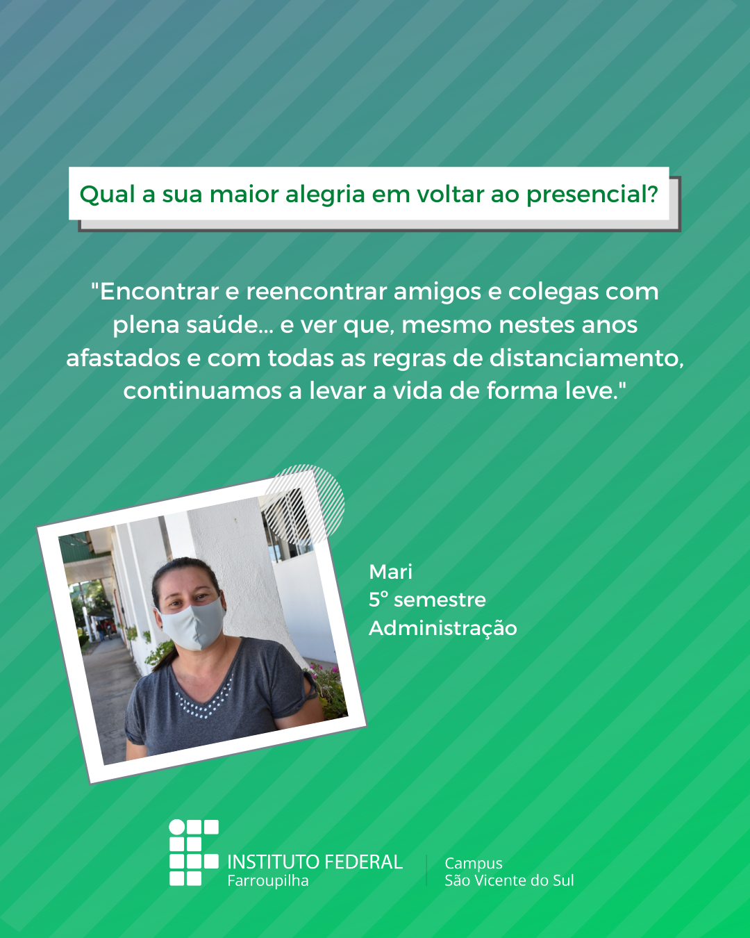 A volta das atividades presenciais no IFFar-São Vicente do Sul foi um momento muito esperado por todos aqueles que frequentavam diariamente o campus e também para quem ainda não havia tido a possibilidade de desenvolver suas atividades presencialmente. Com o objetivo de celebrar e dar voz à nossa comunidade neste momento tão aguardado, foi realizada a campanha ALEGRIAS & DESEJOS, onde perguntamos para estudantes, servidores(as) e terceirizados(as) sobre as suas maiores alegrias em voltar presencialmente ao campus e quais os desejos para este semestre que tinha acabado de iniciar.