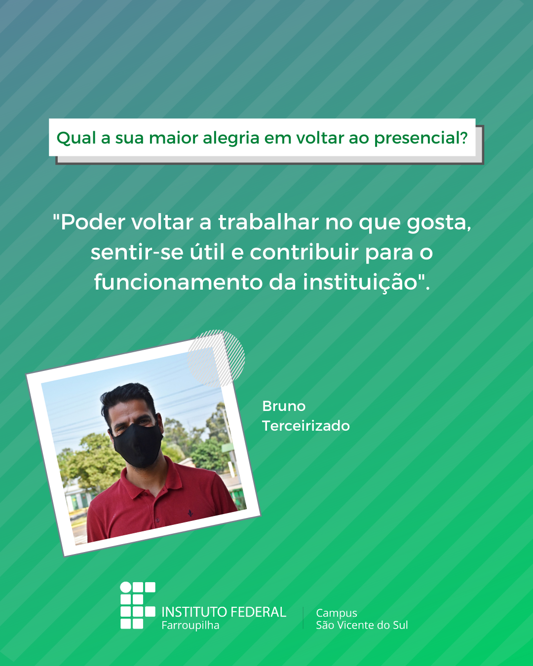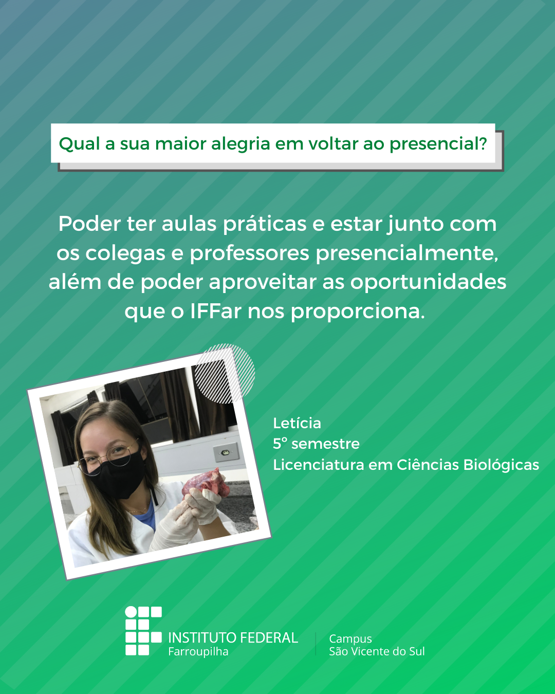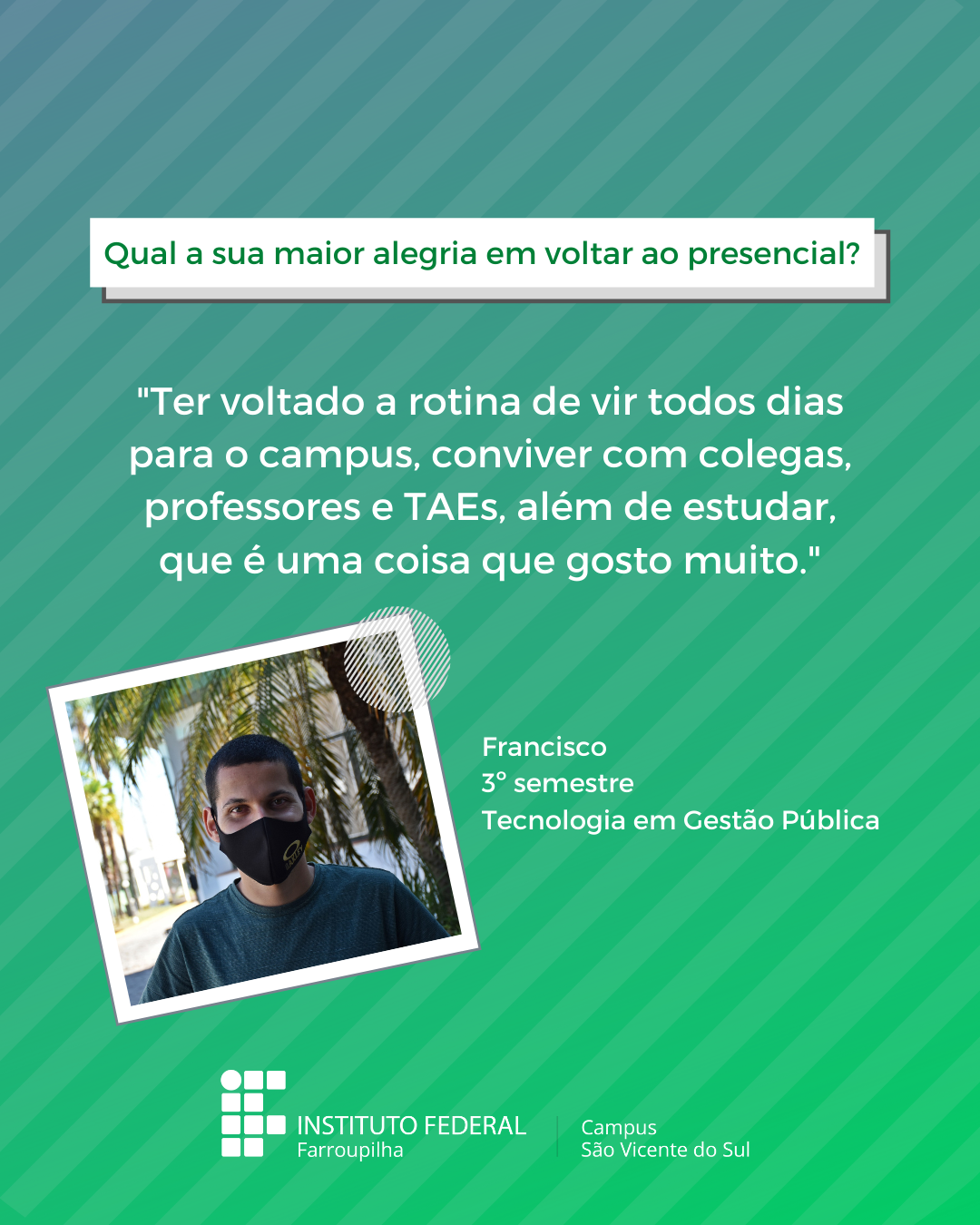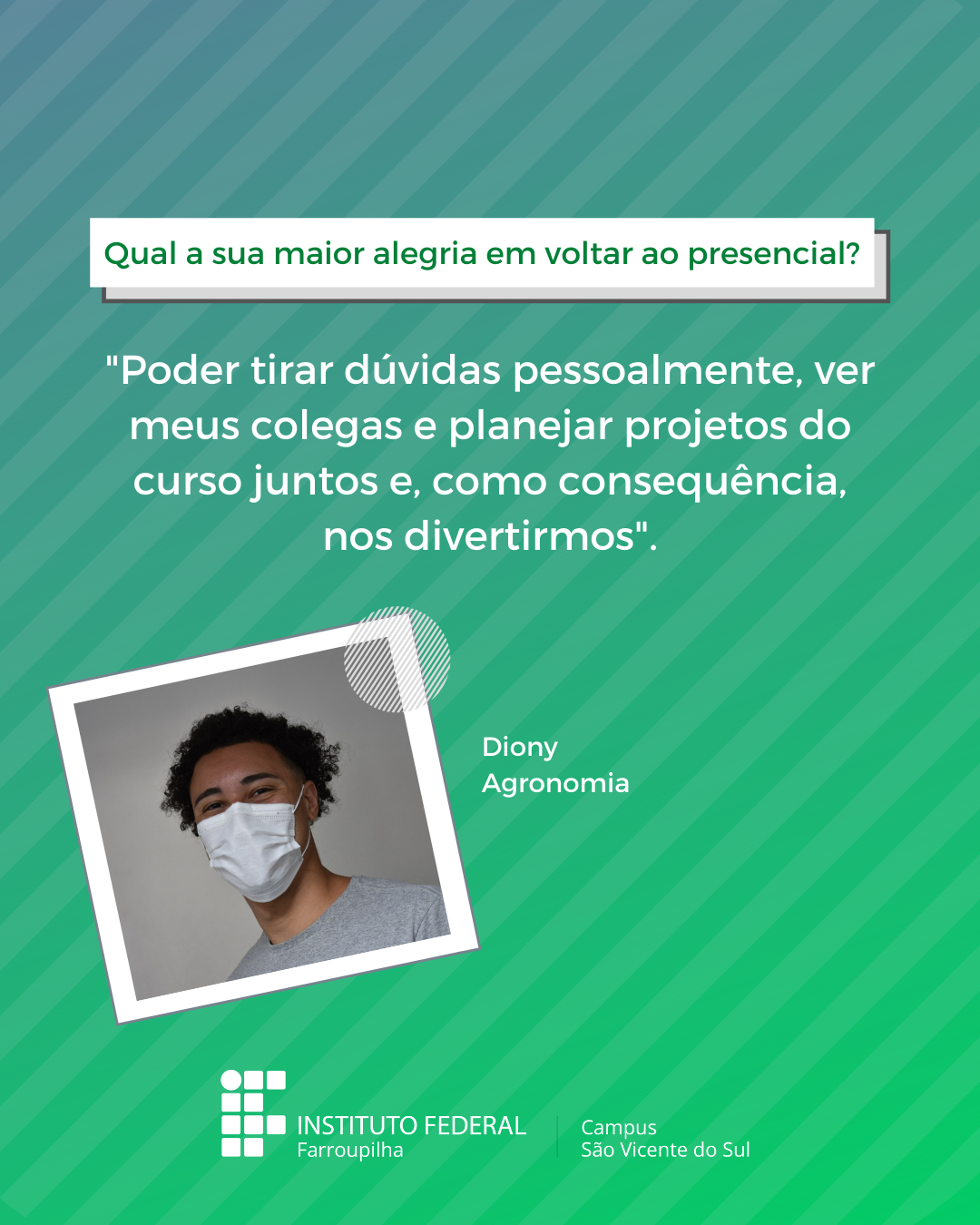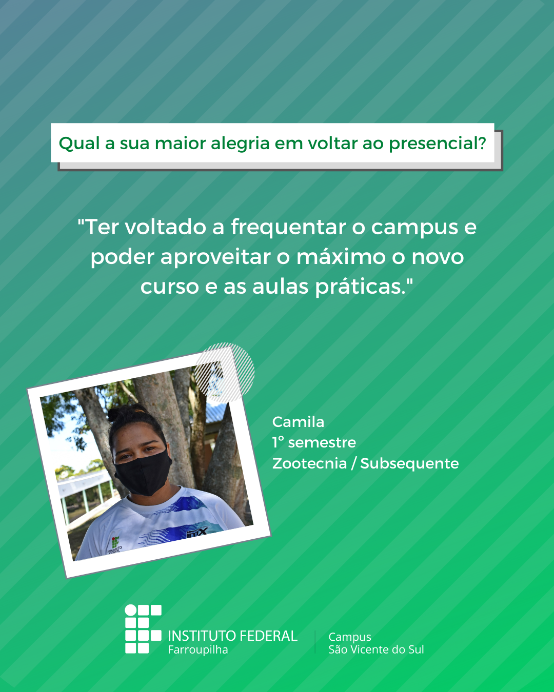 A volta das atividades presenciais no IFFar-São Vicente do Sul foi um momento muito esperado por todos aqueles que frequentavam diariamente o campus e também para quem ainda não havia tido a possibilidade de desenvolver suas atividades presencialmente. Com o objetivo de celebrar e dar voz à nossa comunidade neste momento tão aguardado, foi realizada a campanha ALEGRIAS & DESEJOS, onde perguntamos para estudantes, servidores(as) e terceirizados(as) sobre as suas maiores alegrias em voltar presencialmente ao campus e quais os desejos para este semestre que tinha acabado de iniciar.