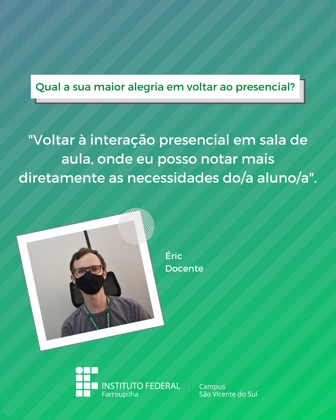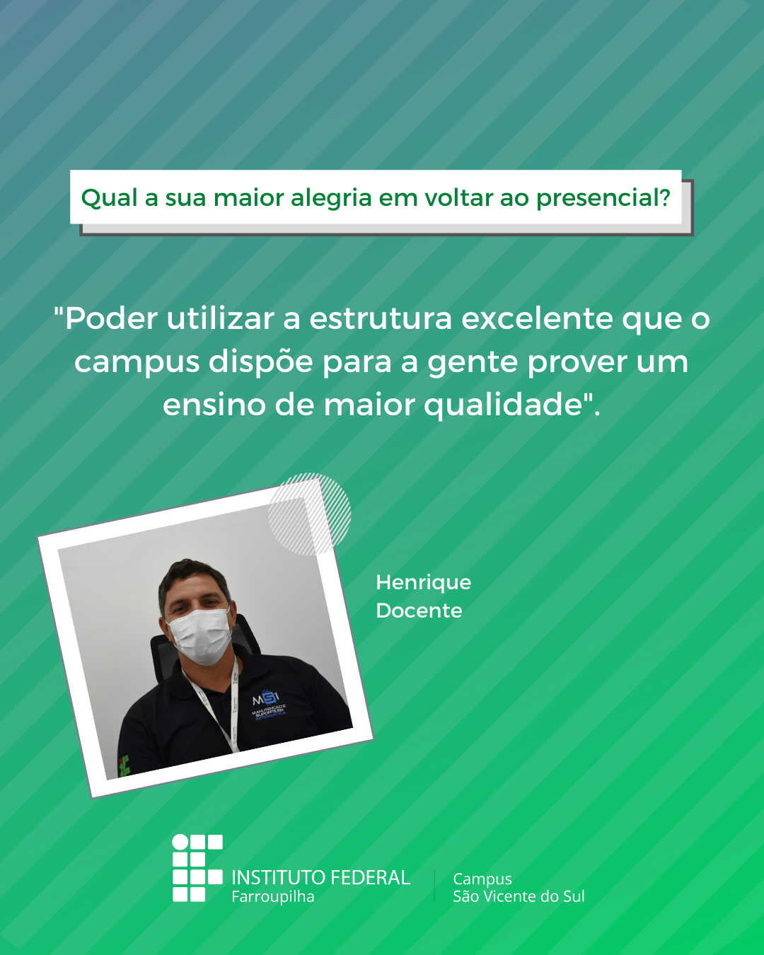 Através de post nas páginas oficias do Campus SVS no Facebook, se pretendeu dar voz para que diferentes pessoas de nossa comunidade pudessem expor suas expectativas, após o longo período em que a instituição não recebeu aulas presenciais, devido a pandemia de Covid-19. Durante as primeiras semanas de aula, foram divulgados depoimentos diários em nossas redes. Você pode conferir nas imagens abaixo: