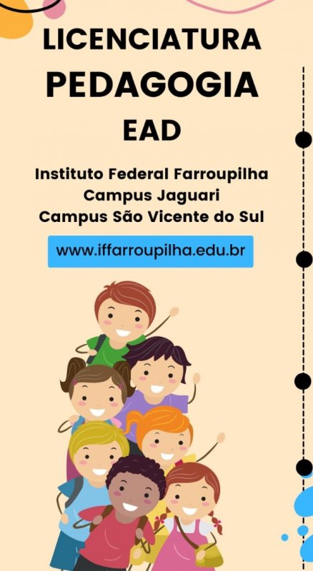 Umas das novidades do Processo Seletivo 2023 para os Cursos Superiores do Campus São Vicente do Sul será o Curso de Licenciatura em Pedagogia, oferecido na modalidade EaD. Serão oferecidas 80 vagas anuais, nos polos localizados nas cidades de Santiago e São Gabriel.