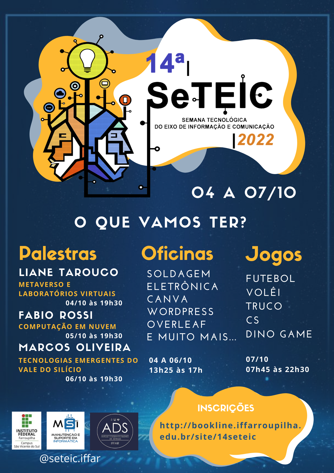 Entre os dias 4 e 7 de outubro, ocorrerá a 14ª Semana Tecnológica do Eixo de Informação e Comunicação (14ª SeTEIC), evento elaborado pelos cursos Integrado em Manutenção e Suporte em Informática e Superior em Análise e Desenvolvimento de Sistemas do IFFar - Campus São Vicente do Sul.