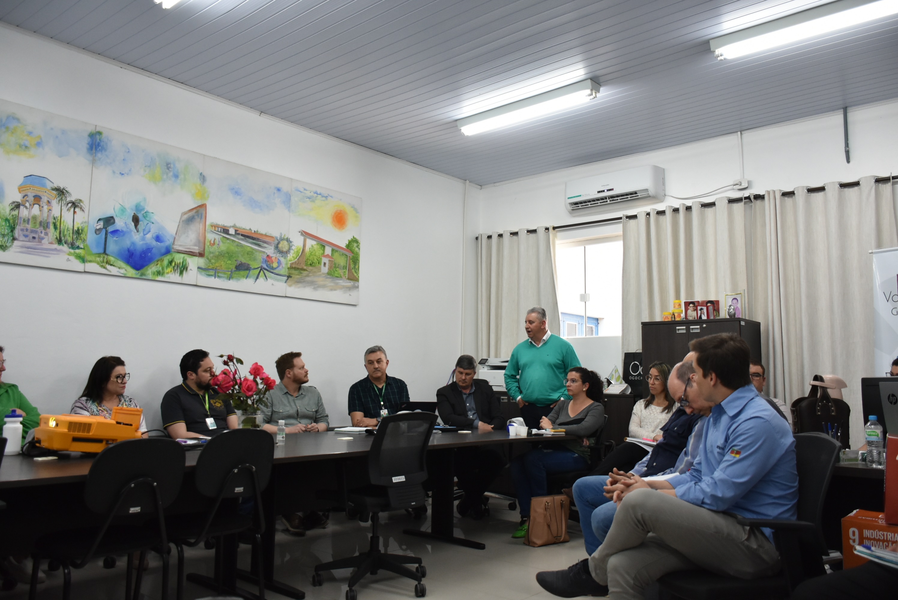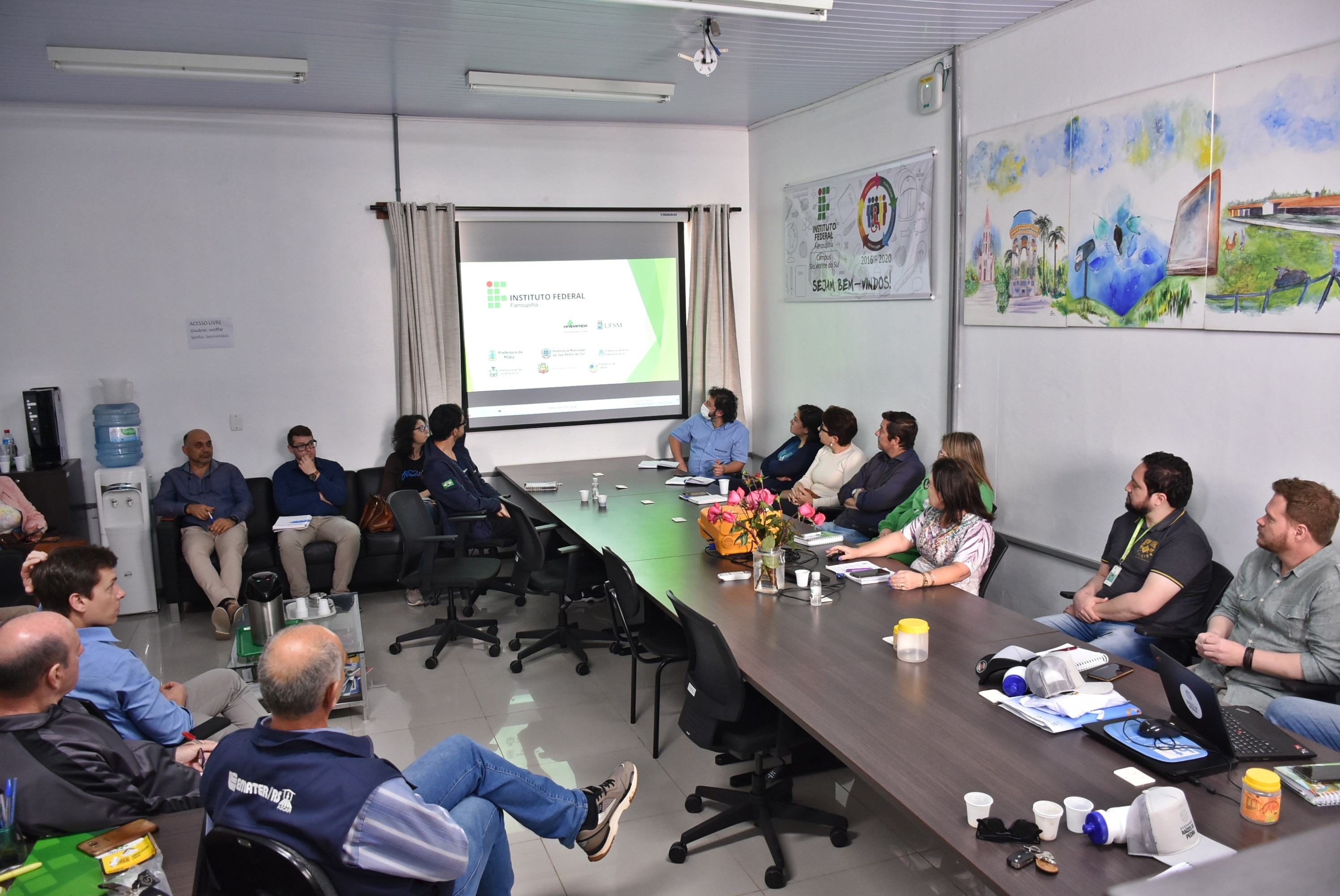 Além da prof.ª Ângela Marinho, pró-reitora de Extensão, e Diogo Maus, da Coordenação de Programas Sociais, estiveram reunidos na oportunidade, os secretários e secretárias e Agricultura, Pecuária e Meio Ambiente dos 6 municípios que compõe o Geoparque Raízes de Pedra; representantes das Diretorias de Pesquisa, Extensão e Produção dos campi de Júlio de Castilhos e SVS; membros do Grupo Dinamizador, composto pelas secretárias municipais de Turismo. Também estiveram presentes o prefeito de Jaguari, Roberto Turchiello; o vice-prefeito de Mata, Maurício Taschetto, e o vice prefeito de SVS, Luis Antonio Ferreira dos Santos.