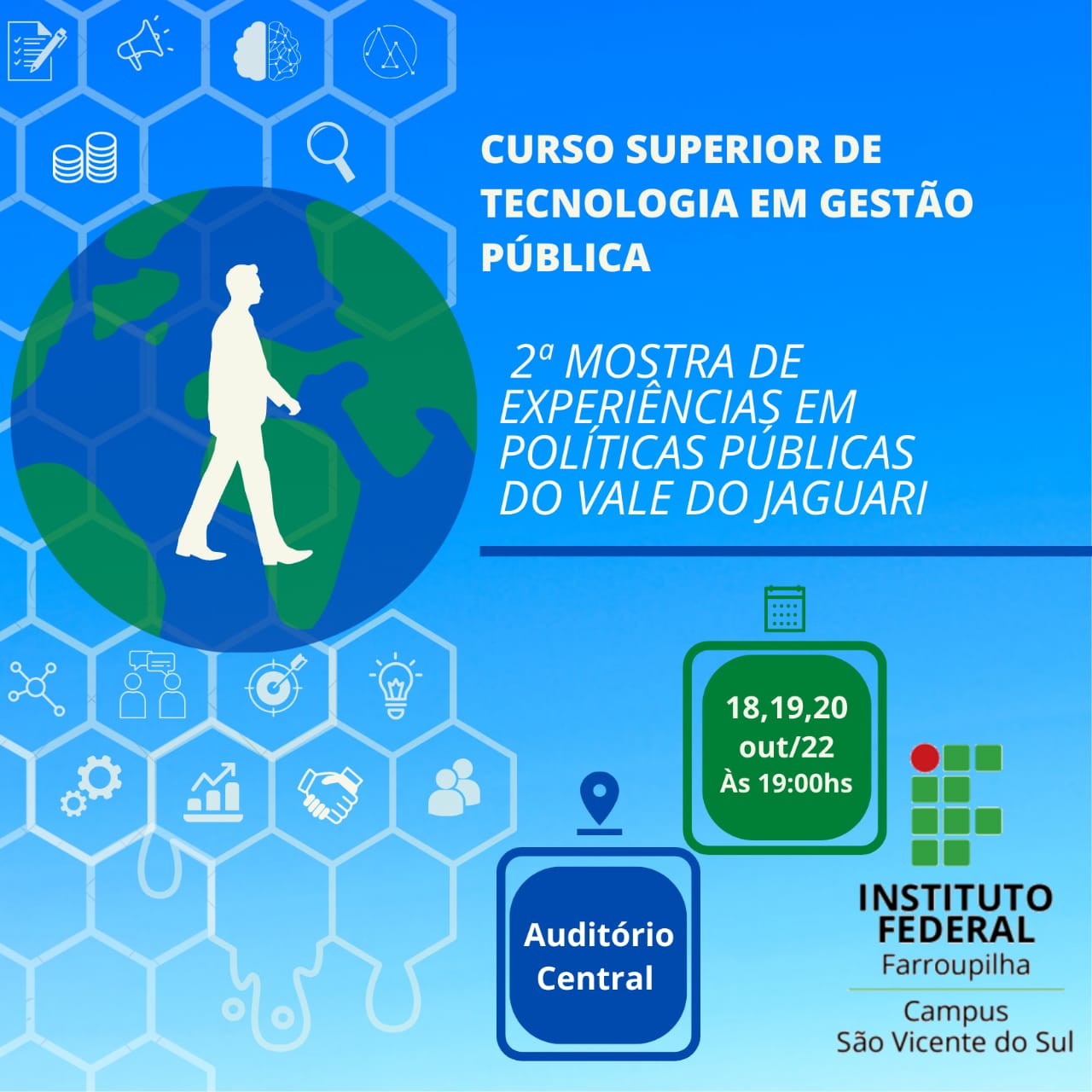 Nos dias 18, 19 e 20 de outubro, o Campus São Vicente do Sul, promove a 2ª Mostra de Experiências em Políticas Públicas do Vale do Jaguari, realizada pelo Curso Superior de Tecnologia em Gestão Pública.