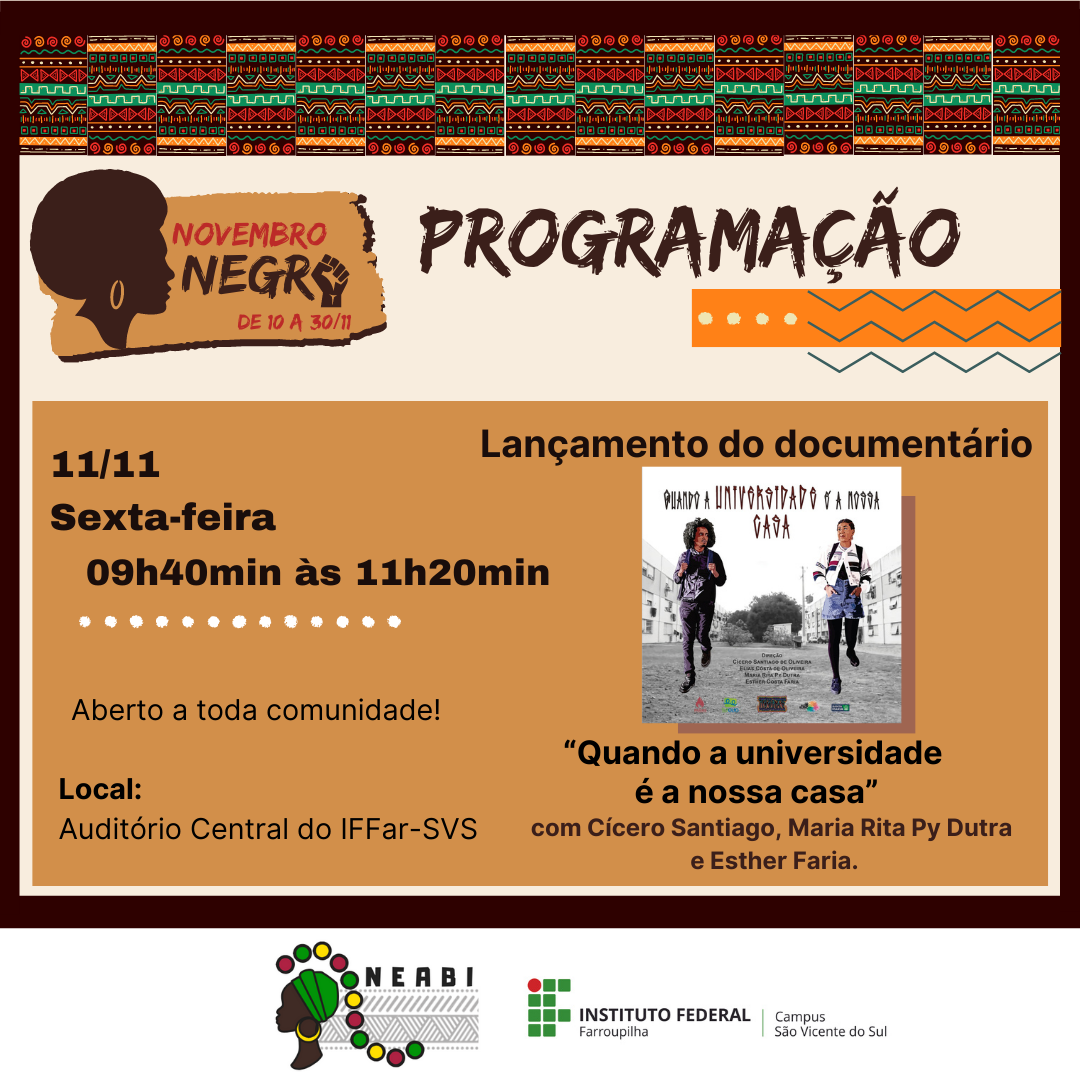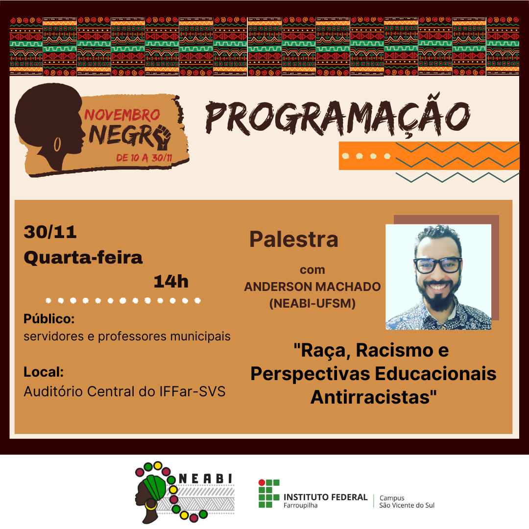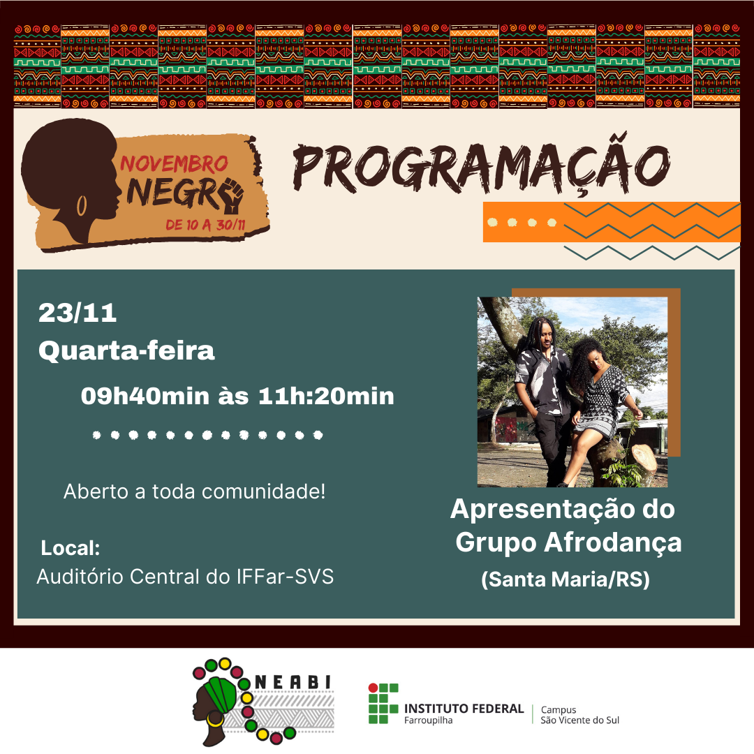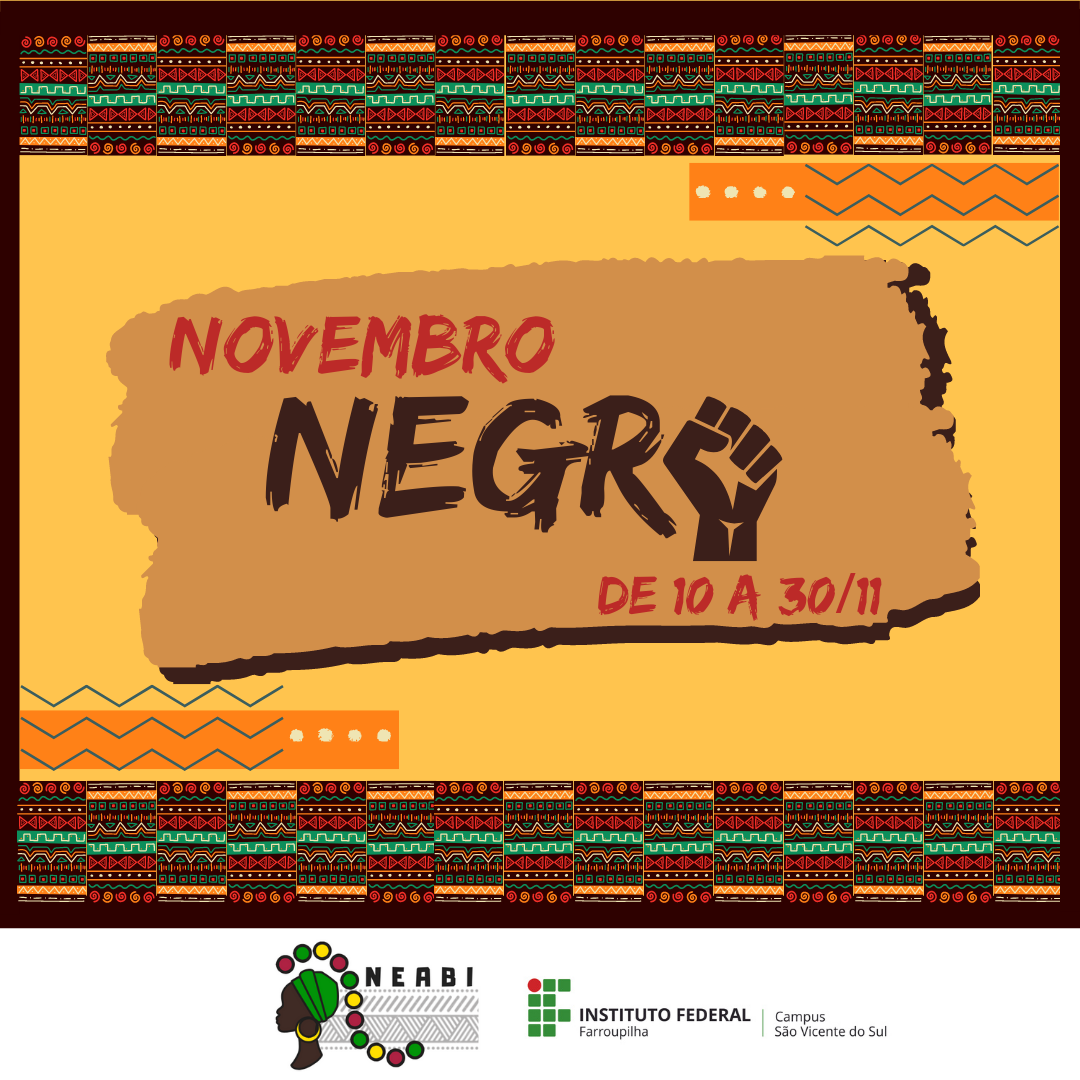 De 10 a 30 de novembro, a comunidade escolar e acadêmica do Instituto Federal Farroupilha – Campus São Vicente do Sul e comunidade externa poderão conferir as atividades relacionadas ao Novembro Negro, que busca refletir sobre problemáticas e lutas da população afro brasileira, além de marcar o dia 20/11, Dia Nacional da Consciência Negra.