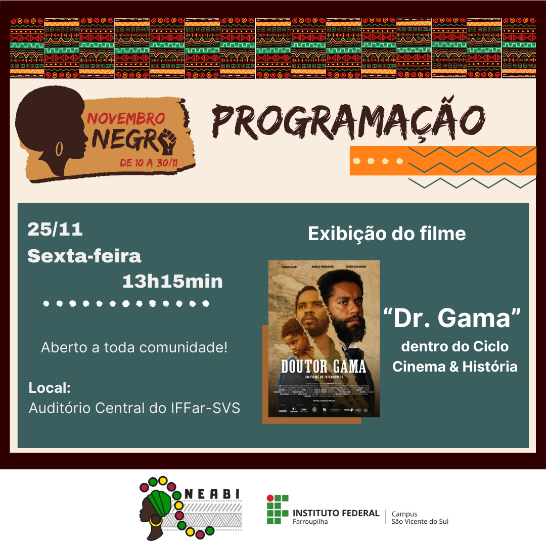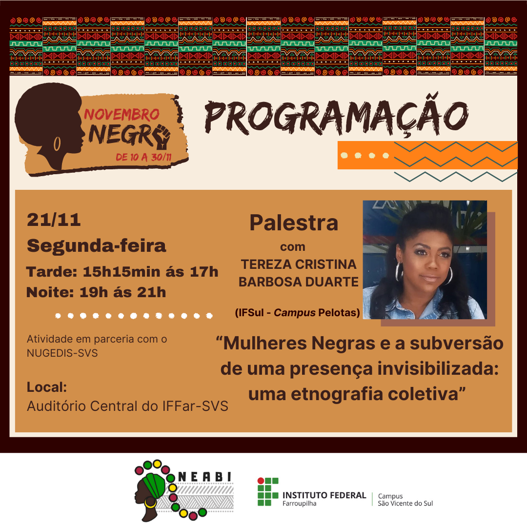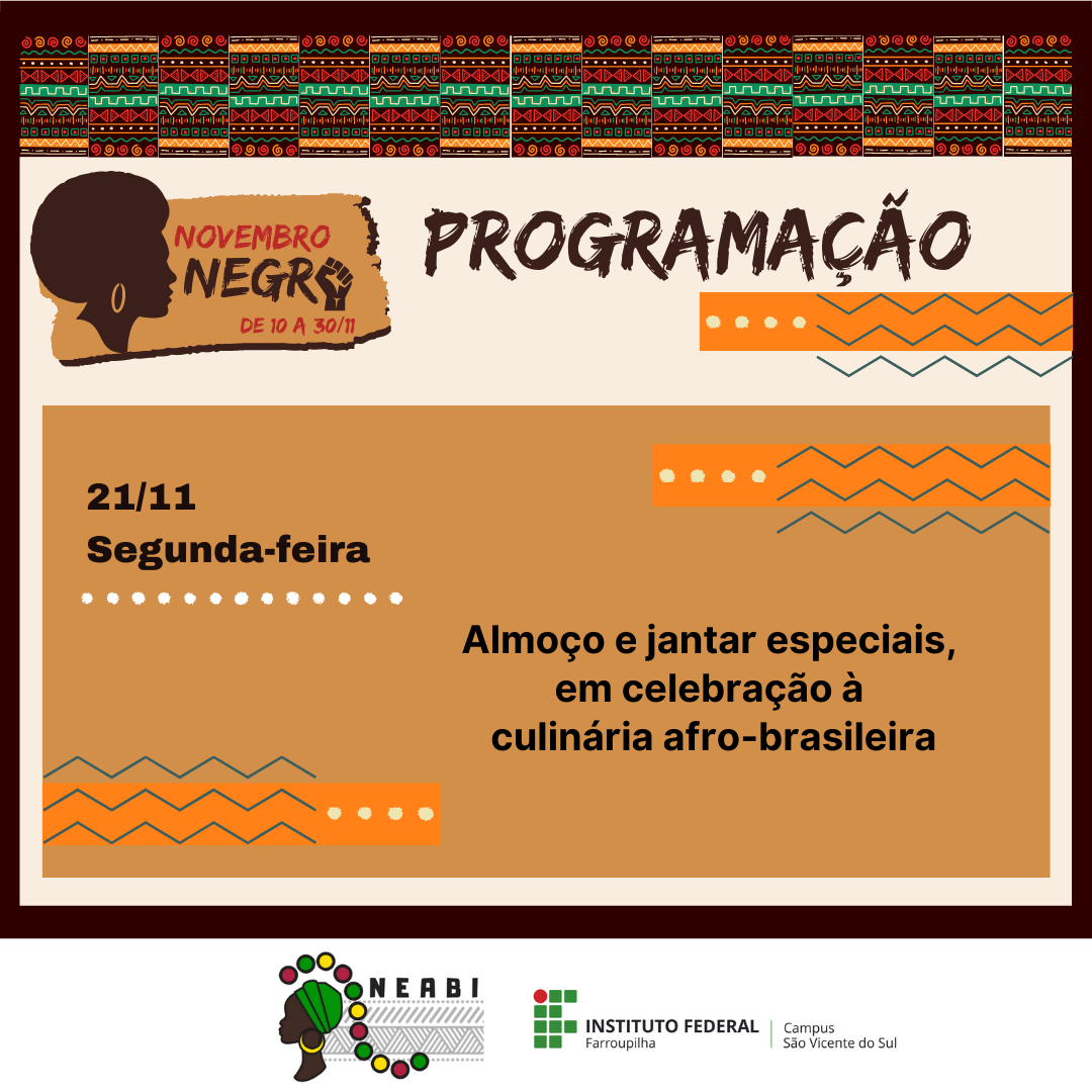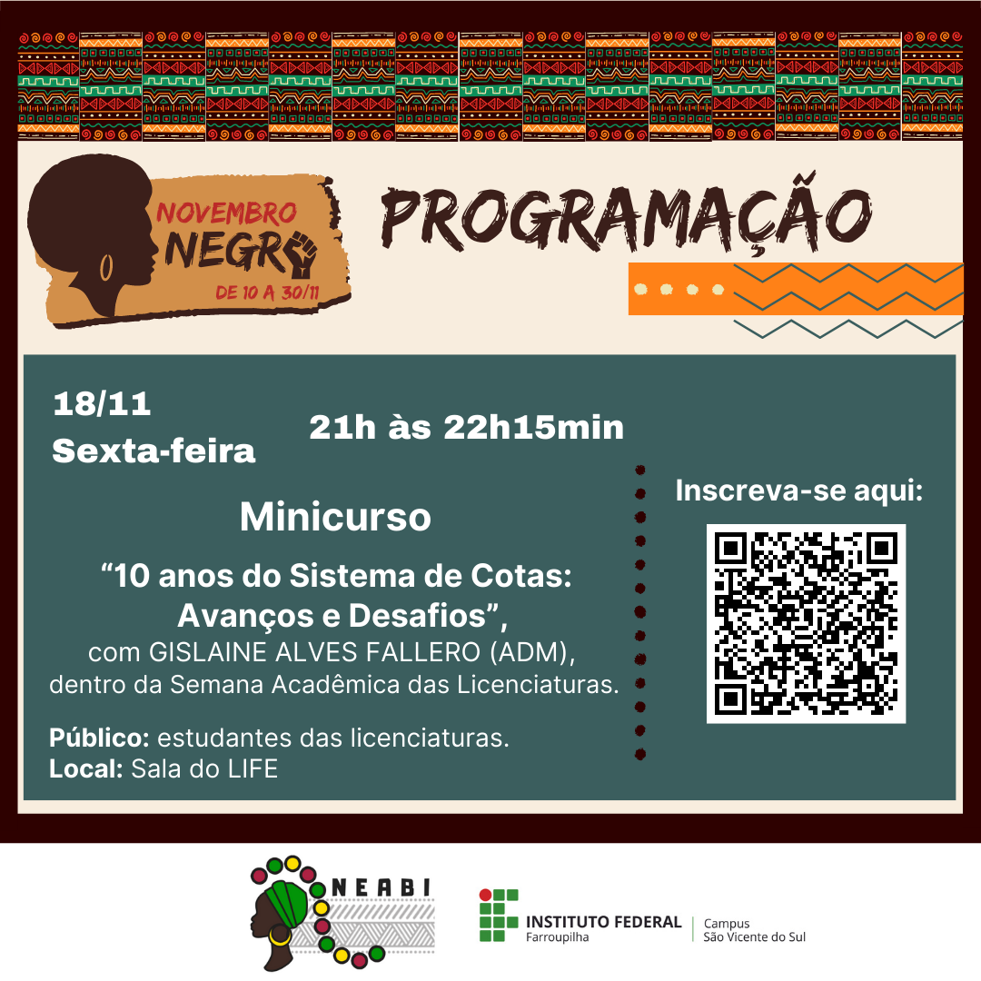 De 10 a 30 de novembro, a comunidade escolar e acadêmica do Instituto Federal Farroupilha – Campus São Vicente do Sul e comunidade externa poderão conferir as atividades relacionadas ao Novembro Negro, que busca refletir sobre problemáticas e lutas da população afro brasileira, além de marcar o dia 20/11, Dia Nacional da Consciência Negra.