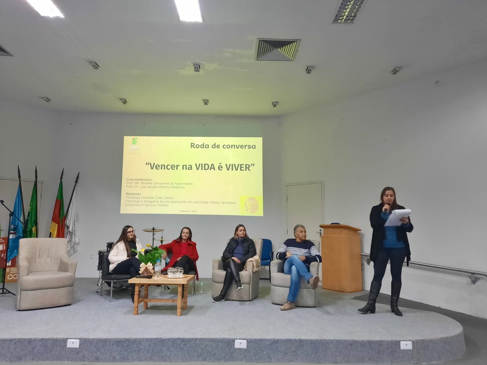 Já para os cursos superiores, foi realizada, na última quarta-feira (27/09), a roda de conversa “Vencer na vida é viver”, com relatos de experiência do prof. Luis Aquiles Martins Medeiros e da profª. Michele Severo Gonçalves. Na abertura, houve apresentação musical de Cristopher Goulart (bateria) e Leo Netto (guitarra).