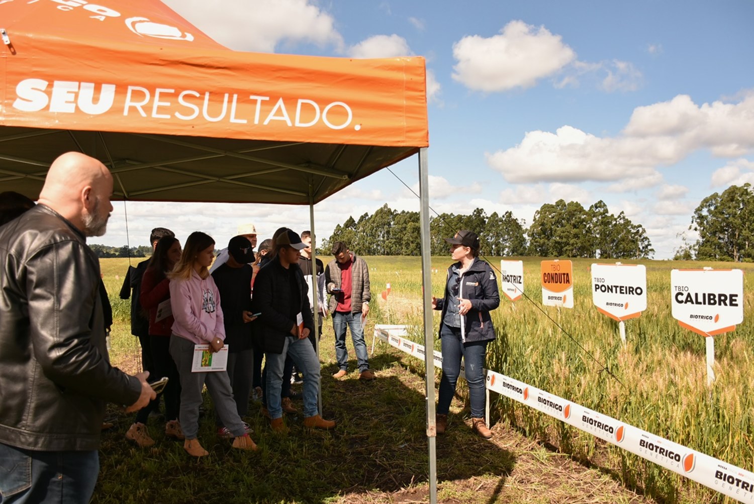 Exibição do modo de ação, recomendações e experimentos em andamento relativos ao tema de bioinsumos promotores de crescimento e indutores de resistência na cultura do trigo. Como parceiras, participaram as empresas Biotrop e Inocular;