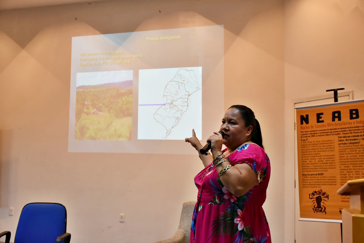 Em sua fala, Laysa apresentou aspectos socioculturais do povo Kaingang, como costumes e tradições; organização, interações e mobilidade social; a fim de desmistificar estereótipos indígenas e aproximar o público da cultura de seu povo.