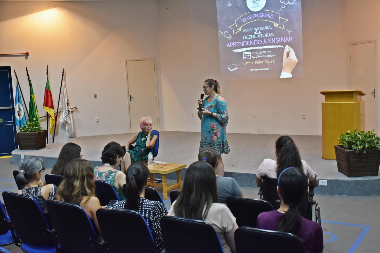 Na noite do dia 22, quinta-feira, ocorreu a aula inaugural das licenciaturas presenciais – Ciências Biológicas e Química. A palestra “Aprendendo a ensinar” foi ministrada pela profª Esther Pillar Grossi, educadora com mais de trinta obras lançadas sobre matemática, processo cognitivo e alfabetização. Também foi deputada federal pelo Rio Grande do Sul e fundadora, em 1970, do Grupo de Estudos sobre Educação, Metodologia de Pesquisa e Ação (GEEMPA), existente até hoje, na cidade de Porto Alegre/RS.