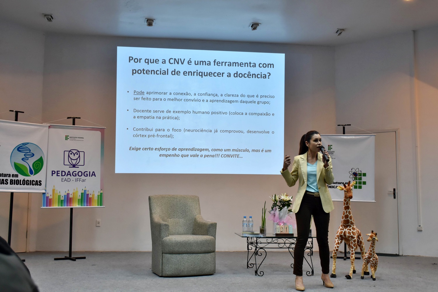 A palestra abordou tópicos introdutórios para entender origens e princípios da Comunicação Não-Violenta (CNV), seus conceitos fundamentais e os quatro componentes (observar, sentir, necessidade, pedido), assim como forneceu ferramentas práticas para aplicação dessa abordagem em sala de aula.