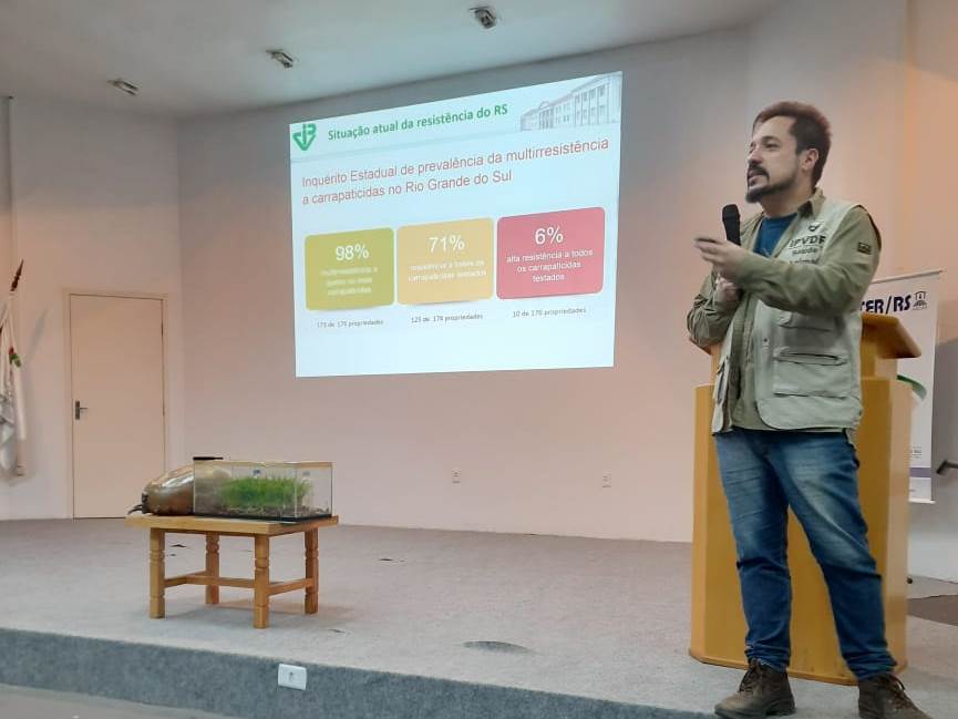 No primeiro momento, houve a palestra “Desafios no controle do carrapato bovino em um cenário de multirresistência”, com o méd-vet. José Reck Júnior, doutor em Parasitologia e pesquisador do Instituto de Pesquisas Veterinárias Desidério Finamor (IPVDF/SEAPI-RS). Na oportunidade, José abordou a questão histórica do manejo sanitário usualmente praticado no controle do carrapato no Brasil, apresentando os principais erros e fornecendo maneiras mais eficientes de tratar o parasita, a fim de manejar a resistência carrapaticida.