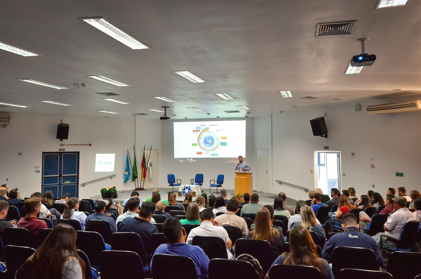A primeira palestra foi ministrada por Waldemiro Aguiar, agricultor de Santa Vitória do Palmar/RS, que abordou o plantio de arroz e soja em terras baixas com manejo de bioinsumos. Após, houve a palestra "Solos como Biblioteca da Vida", proferida por Murilo Teixeira Gonçalves, engenheiro agrônomo e produtor rural. Em sua apresentação, ele destacou a importância da conservação do microbioma do solo como um fator essencial para a produtividade agrícola, ressaltando que os solos são verdadeiros reservatórios de vida e conhecimento natural.