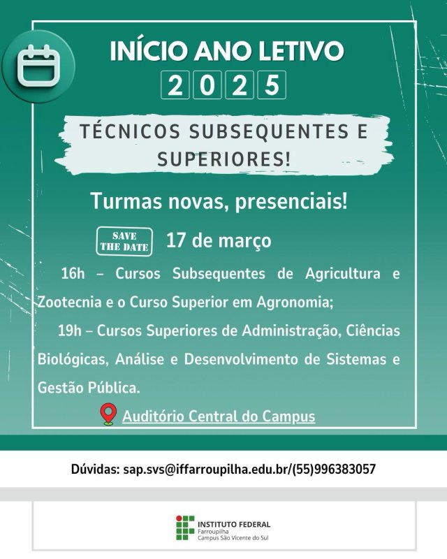 Na próxima segunda-feira, dia 17 de março, o Campus SVS recebe as novas turmas dos Cursos Subsequentes em Agricultura e em Zootecnia e Bacharelado em Agronomia (às 16h); e Bacharelado em Administração, Licenciatura em Ciências Biológicas, Tecnologia em Gestão Pública e Tecnologia em Análise e Desenvolvimento de Sistemas, à noite (19h).
