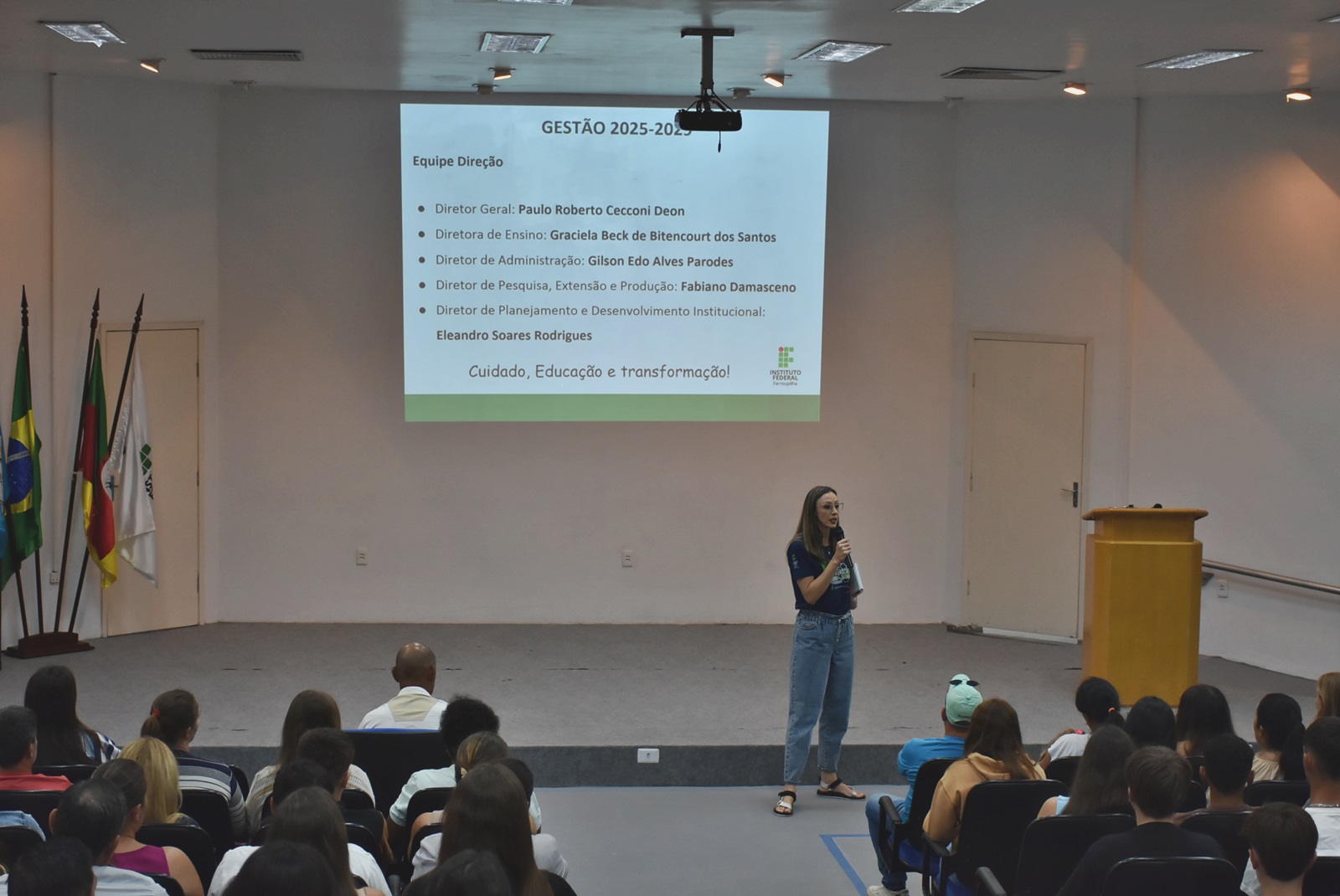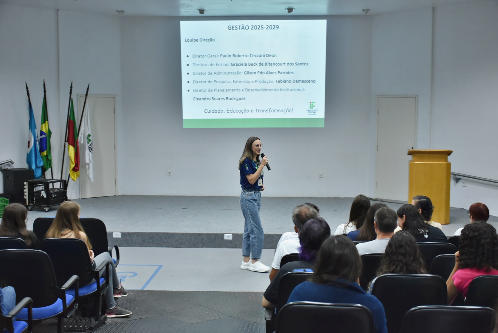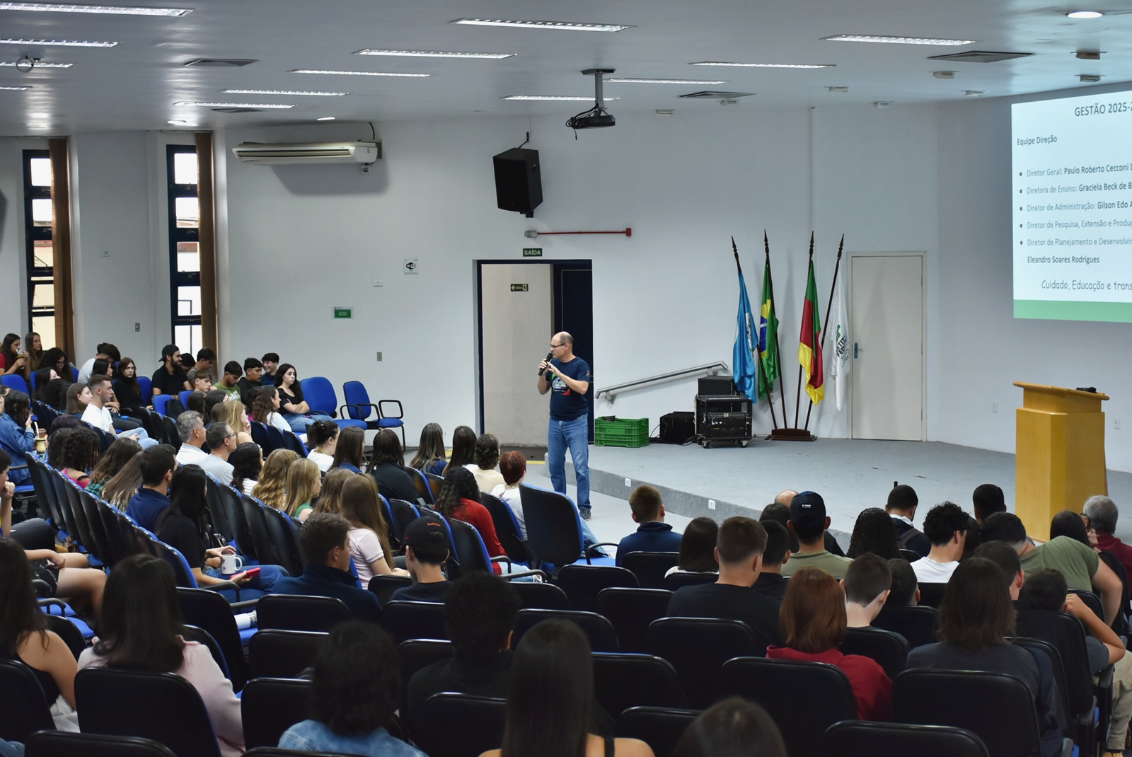 Na ocasião, a nova equipe gestora do campus (mandato 2025-2029) foi apresentada aos presentes. A equipe é composta por: prof. Paulo Roberto Cecconi Deon, no cargo de Diretor Geral; Gilson Edo Alves Parodes, diretor de Administração; profª. Graciela Beck de Bitencourt dos Santos, diretora de Ensino; Fabiano Damasceno, diretor de Pesquisa, Extensão e Produção; e Eleandro Soares Rodrigues, diretor de Planejamento e Desenvolvimento Institucional.