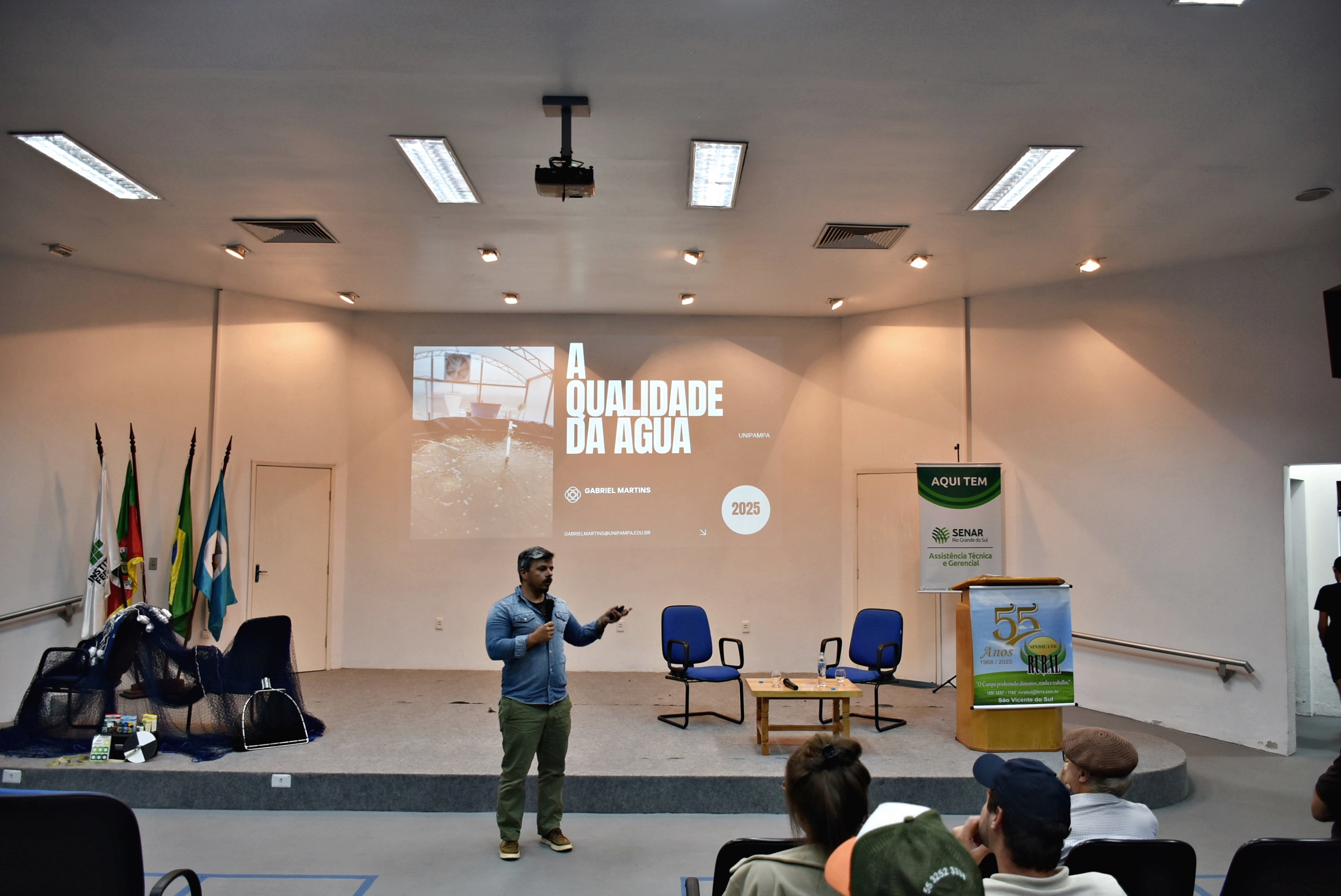 O encontro teve como objetivo promover a formação e a atualização técnica sobre o cultivo de peixes, contando com duas palestras ministradas por professores da Universidade Federal do Pampa (UNIPAMPA). As apresentações abordaram temas essenciais para o sucesso da piscicultura — a alimentação dos peixes e a qualidade da água —, fatores que impactam diretamente o crescimento, a saúde e a qualidade dos animais.