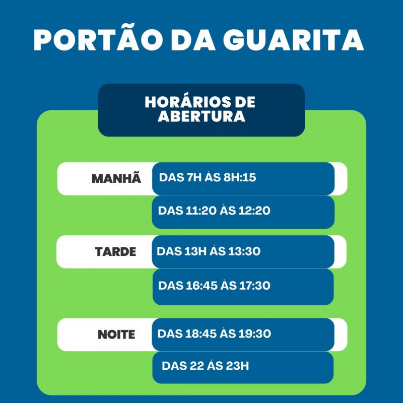 As aberturas coincidem com os horários de início e término das aulas, nos turnos manhã, tarde e noite. Veja abaixo o cronograma de abertura/fechamento do portão principal: