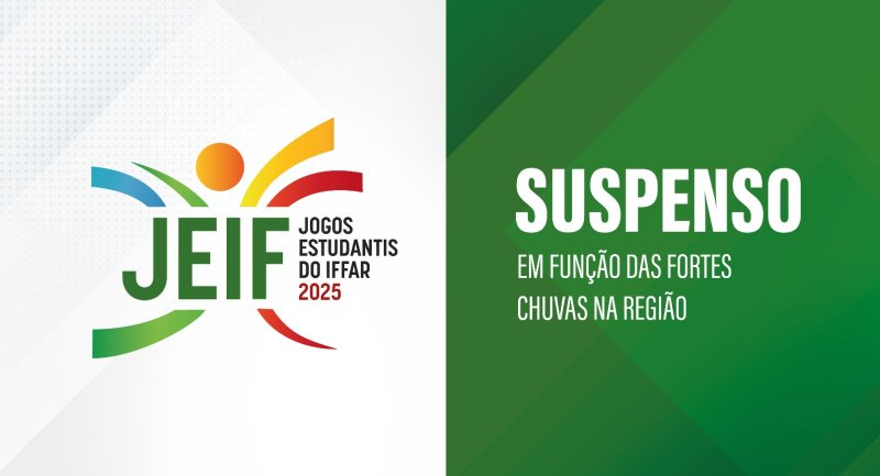 Os Jogos Estudantis do IFFar (Jeif 2025), que seriam realizados a partir desta terça-feira (17) em São Vicente do Sul, foram suspensos em virtude das fortes chuvas ocorridas na região. Os Jogos dos IFs da Região Sul (JIFSul 2025), que serão sediados pelo IFFar no mês de julho, estão mantidos.