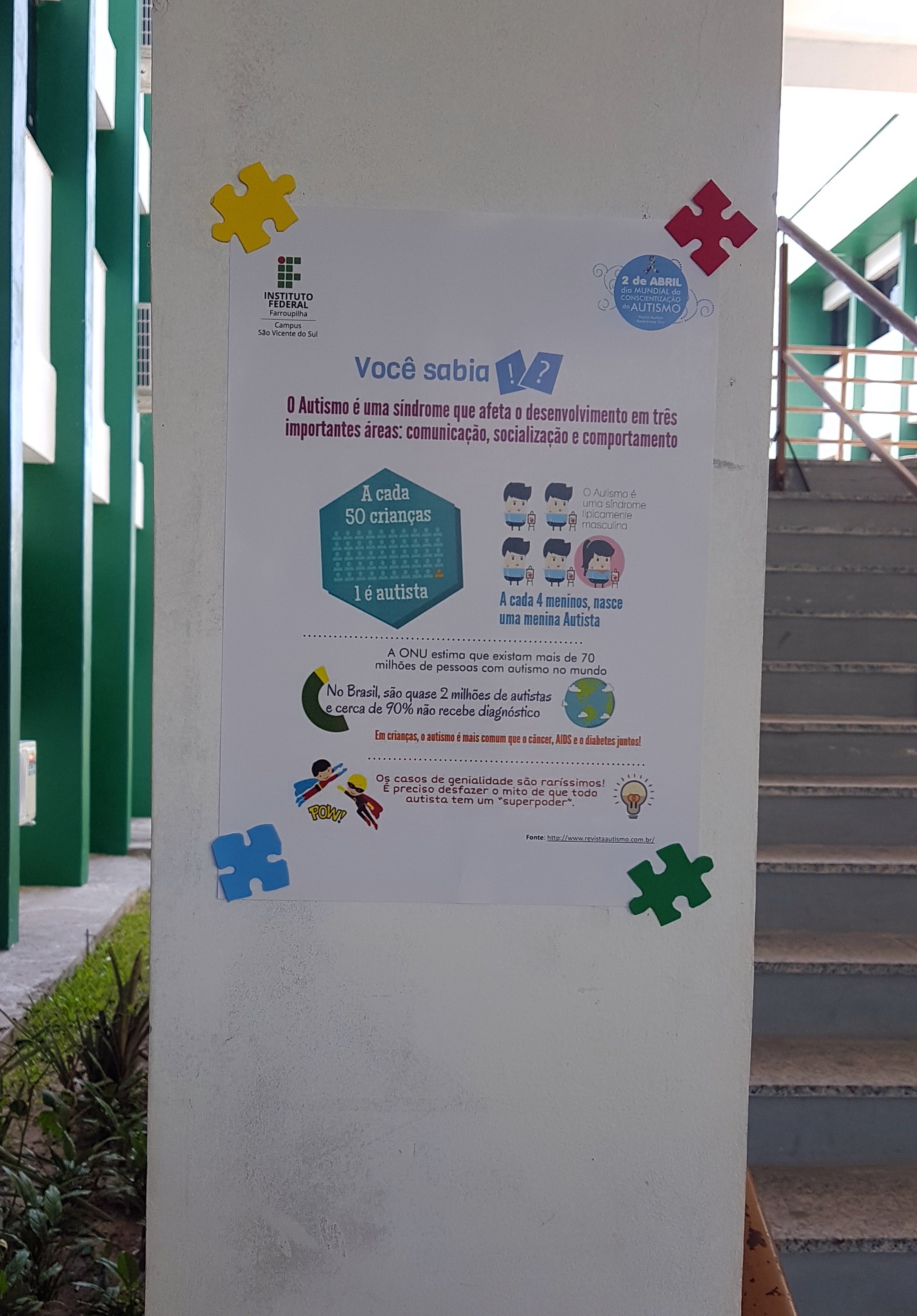 Dia 03 de abril o Campus São Vicente do Sul, através do NAPNE, realizou uma campanha apoiando a Conscientização do Transtorno do Espectro Autista (TEA)