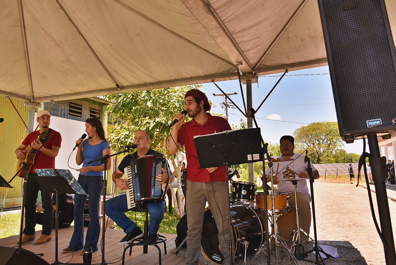 Na terça-feira, o refeitório serviu um almoço com cardápio especial, acompanhado de bolo comemorativo, momento que teve animação musical do grupo Gurizada do IF, formado pelo servidor Hermes Uberti (gaita) e pelos estudantes Diony Joras (violão), Cristopher Goulart e Wellinton Bueno (bateria), além de Talita de Oliveira e Olavo Govêa (vocal).